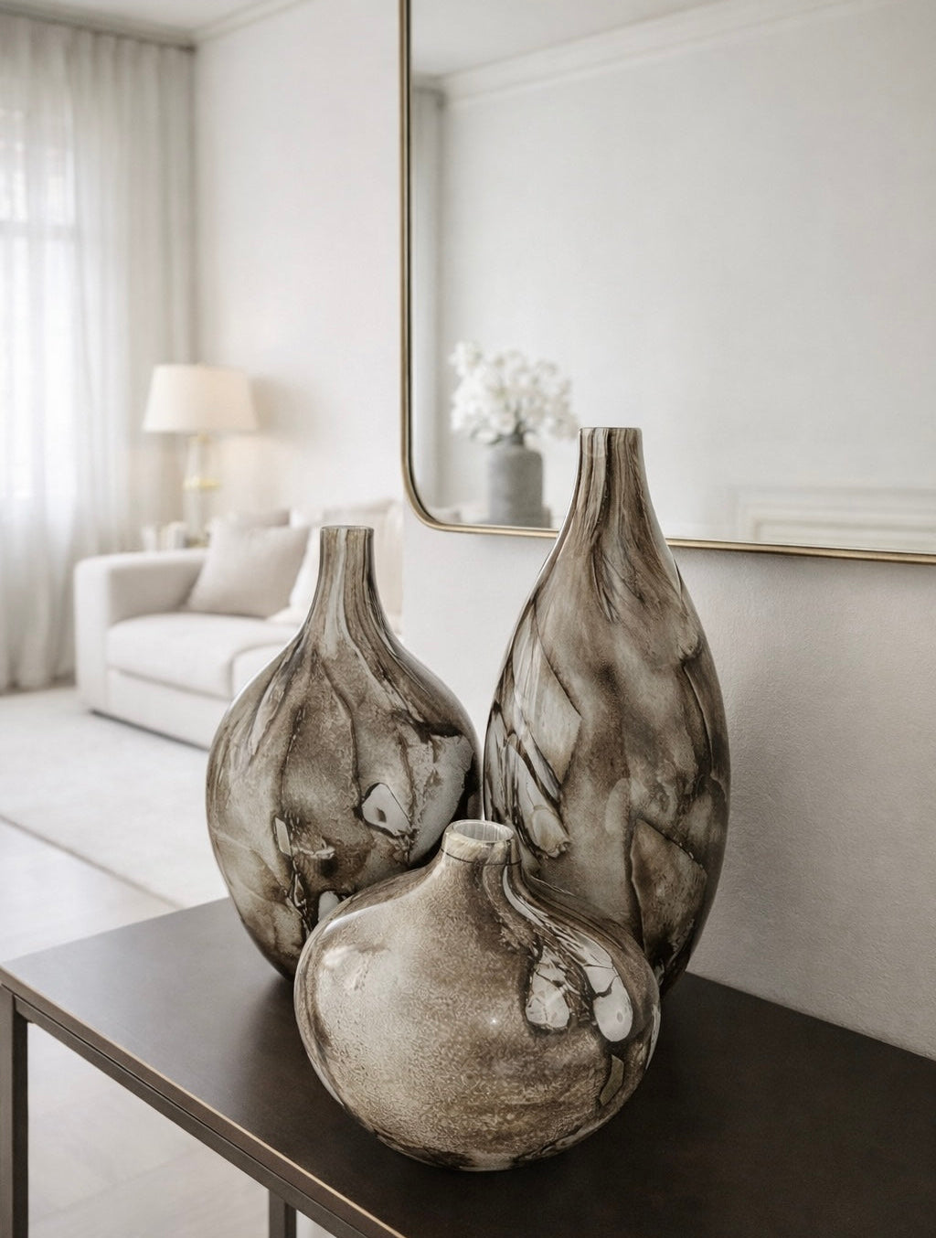 שלישיית אגרטלים בגווני חום־שיש עם דוגמת זכוכית אמנותית. הצורה האלגנטית והגימור המבריק מעניקים אופי ייחודי ומשדרגים כל עיצוב בסגנון יוקרתי.