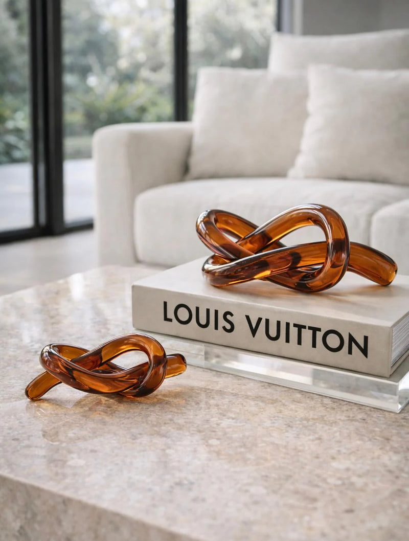 זוג פסלי קשר מזכוכית בגוון יחום יוקרתי עמוק שמוסיף טאץ’ יוקרתי ומודרני לכל סטיילינג. פריטי נוי לבית כאלה יוצרים מוקד עניין אלגנטי ונראים מעולה כחפצי נוי על כל משטח.