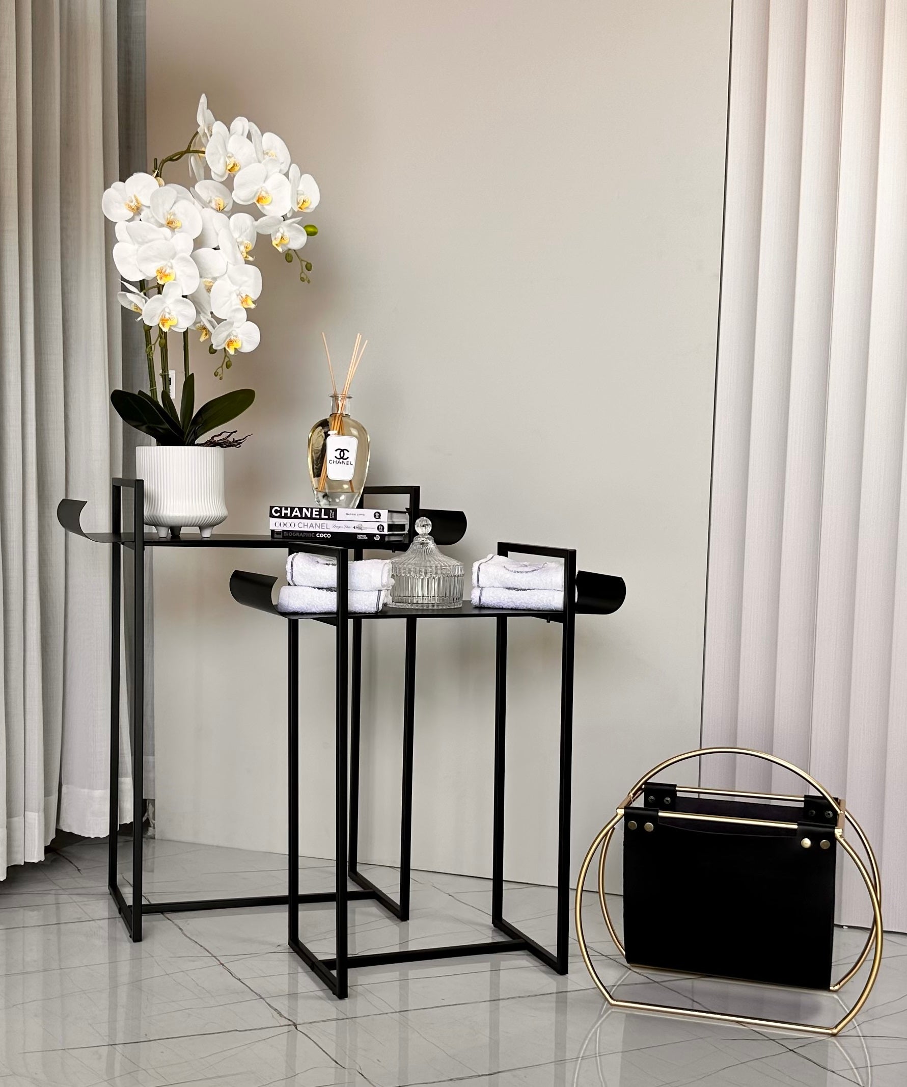 זוג מעמדים עשויים מתכת בצבע שחור.