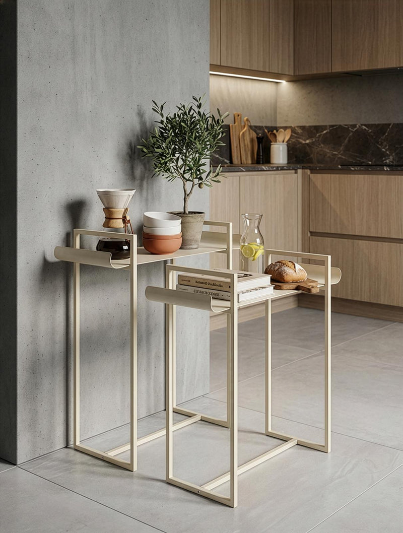 זוג מעמדי מתכת בעיצוב מינימליסטי ומדויק, המשלבים קווים ישרים עם משטחים מעוגלים למראה אלגנטי, מאוזן ועל-זמני. המעמדים יוצרים קומפוזיציה מרשימה גם יחד וגם בנפרד, ומוסיפים עומק, גובה ועניין לחלל.