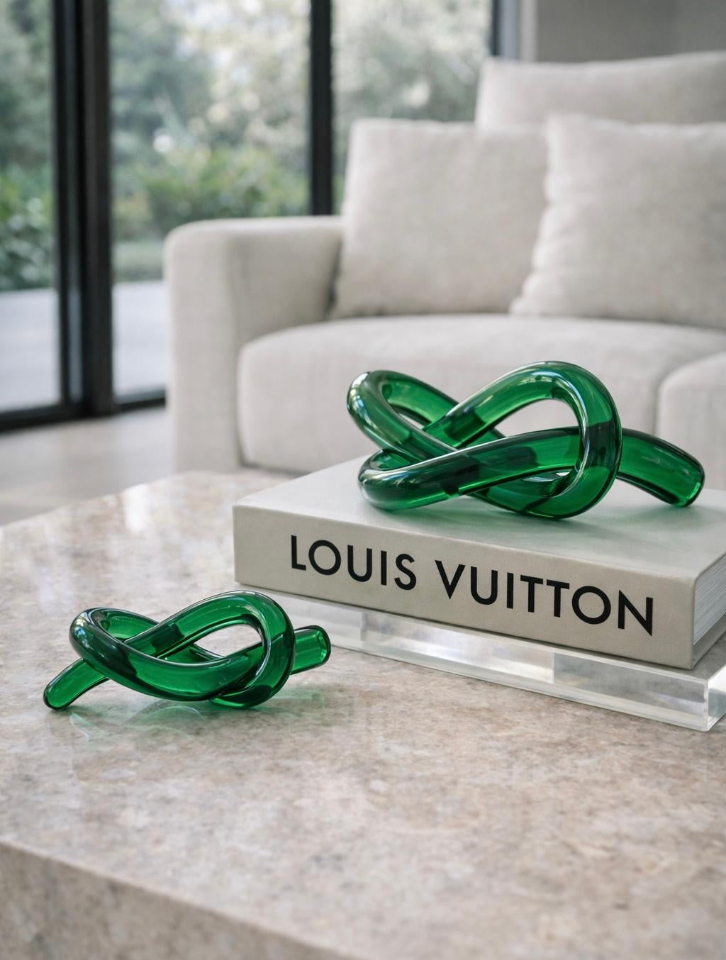 זוג פסלי קשר מזכוכית בגוון ירוק עמוק שמוסיף טאץ’ יוקרתי ומודרני לכל סטיילינג. פריטי נוי לבית כאלה יוצרים מוקד עניין אלגנטי ונראים מעולה כחפצי נוי על כל משטח.