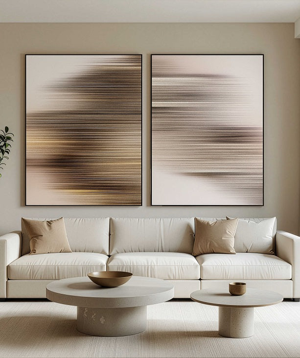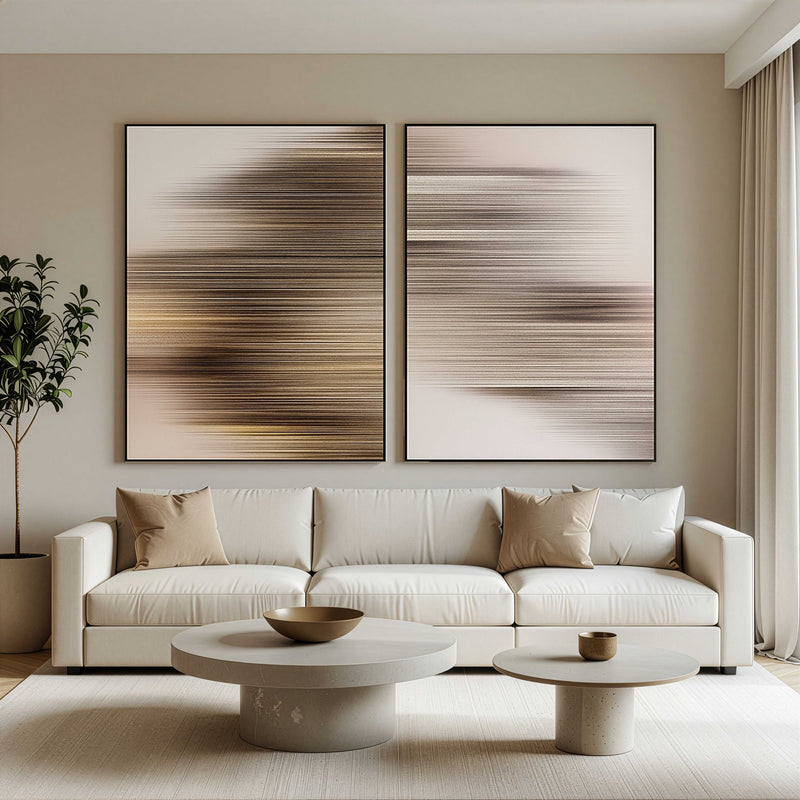 זוג תמונות אבסטרקטיות שהן יצירת אמנות! שילוב גווני החום והמרקם המתוחכם יחד עם הקווים המשתנים יוצרים תחושה של עומק וזרימה ומוסיפים נגיעה אלגנטית ומעודנת.