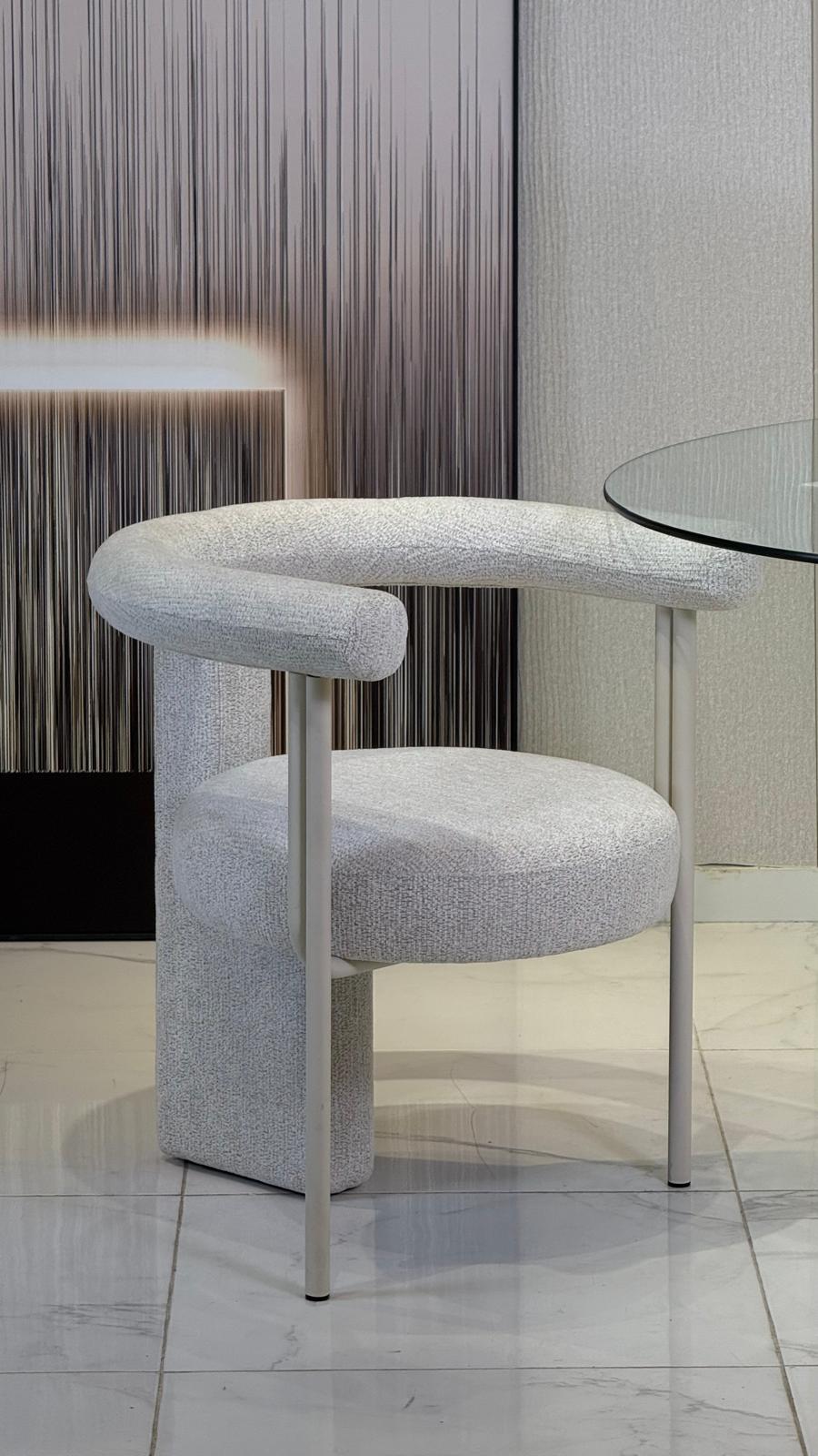 כיסא בעל צורה רכה ומזמינה, עם גב מעוגל העוטף את הגוף ויוצר תחושת נינוחות והרמוניה. השילוב בין הבד הבהיר והנעים למגע לבין קווי המתכת האלגנטיים מעניק איזון מושלם בין חמימות לביתיות לעידון מודרני.