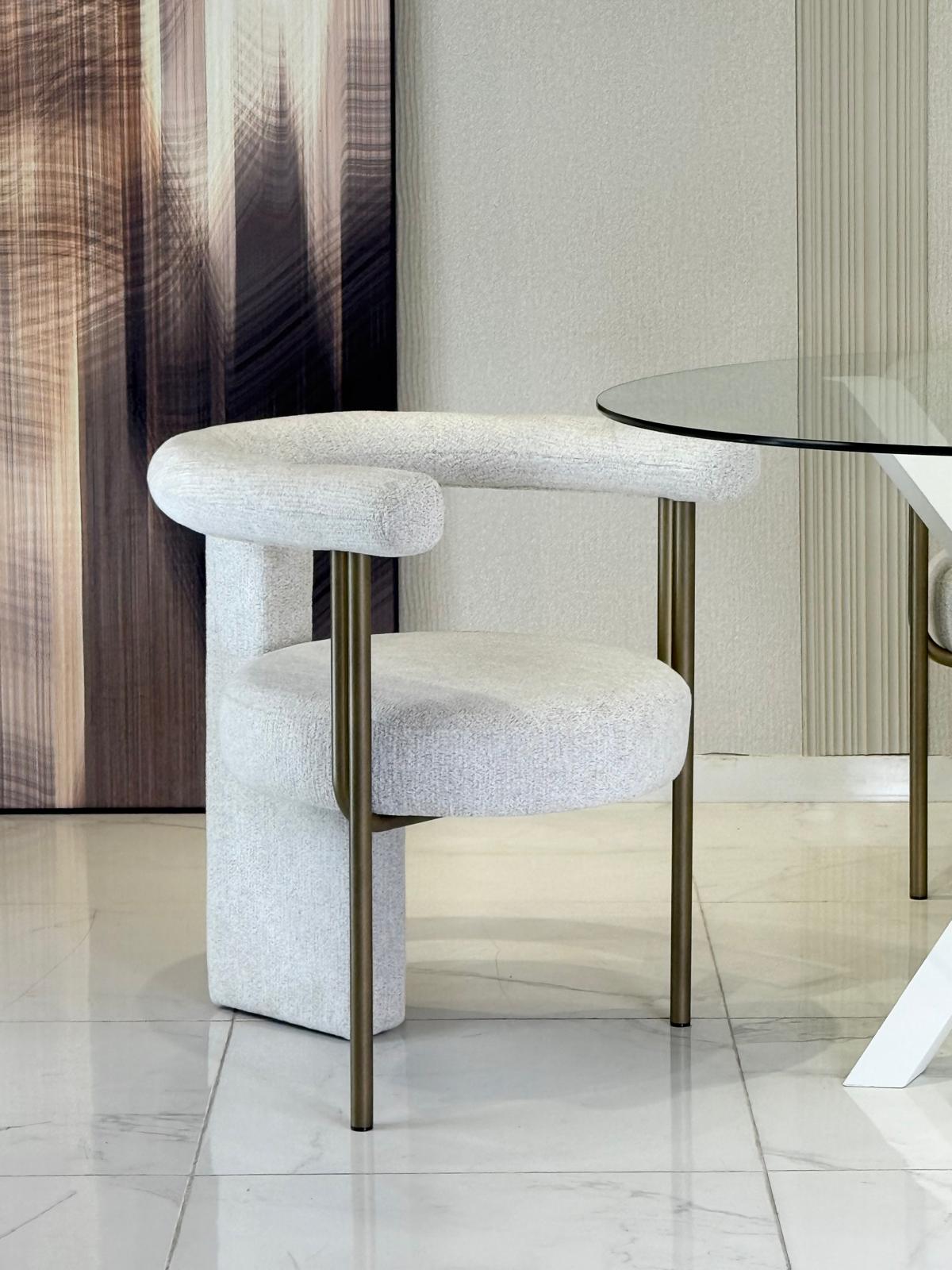 כיסא מודרני עכשווי בעל נוכחות מרשימה ויצוב אלגנטי המשלב קווים מעוגלים עם תחושת רכות וחמימות.
