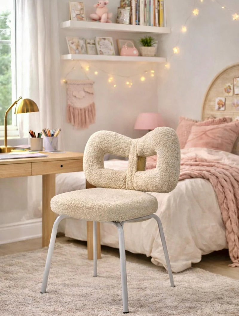 כיסא ילדים מעוצב בקווים עגולים ובטקסטורת בד רכה ונעימה, שמשלב בין נוחות גבוהה למראה עיצובי עדין ומעודן. הכיסא משתלב באופן טבעי בחדרי ילדים, ומוסיף נוכחות רכה ומזמינה שמתאימה לעיצוב החדר מבלי להעמיס עליו.