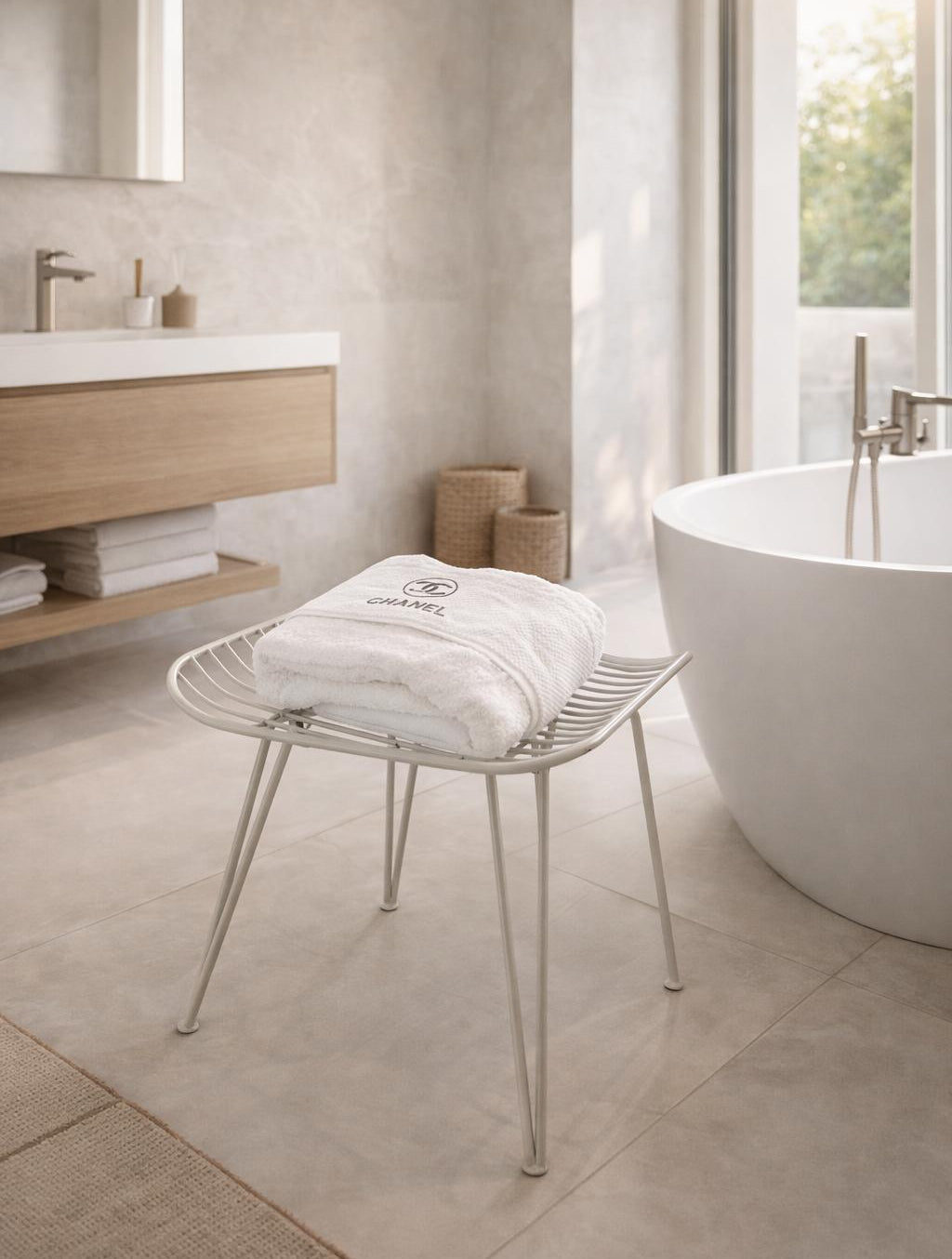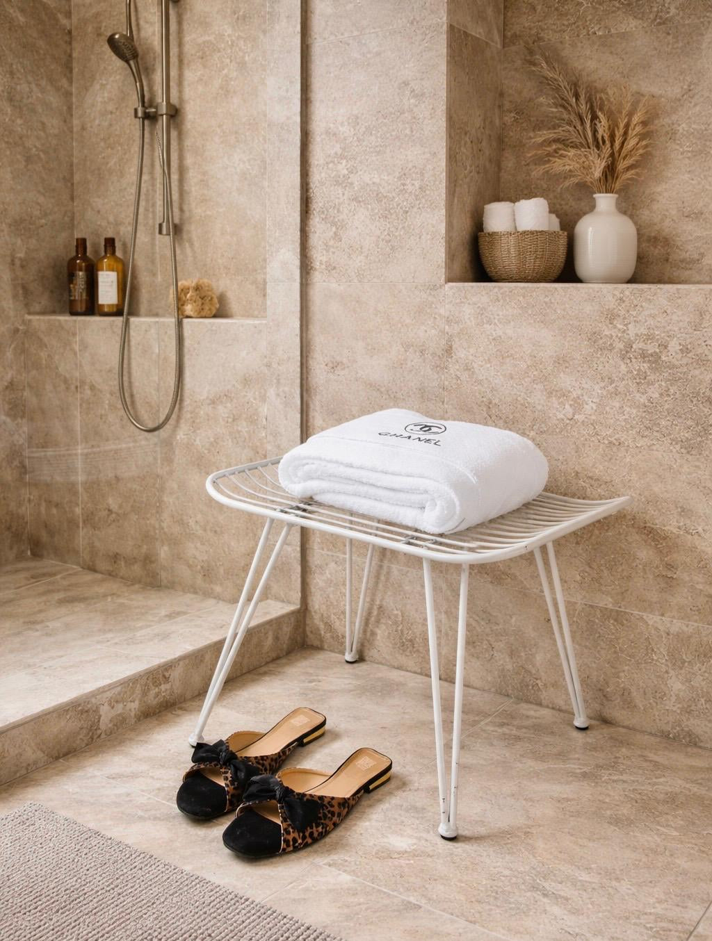 הספסל עשוי מתכת איכותית בגימור חלק ועמיד, עם רגליים דקות ומבנה יציב המעניק תחושת ריחוף אלגנטית. פתרון אידיאלי להנחת מגבות, ישיבה נוחה או כפריט דקורטיבי שמשלים את האווירה.