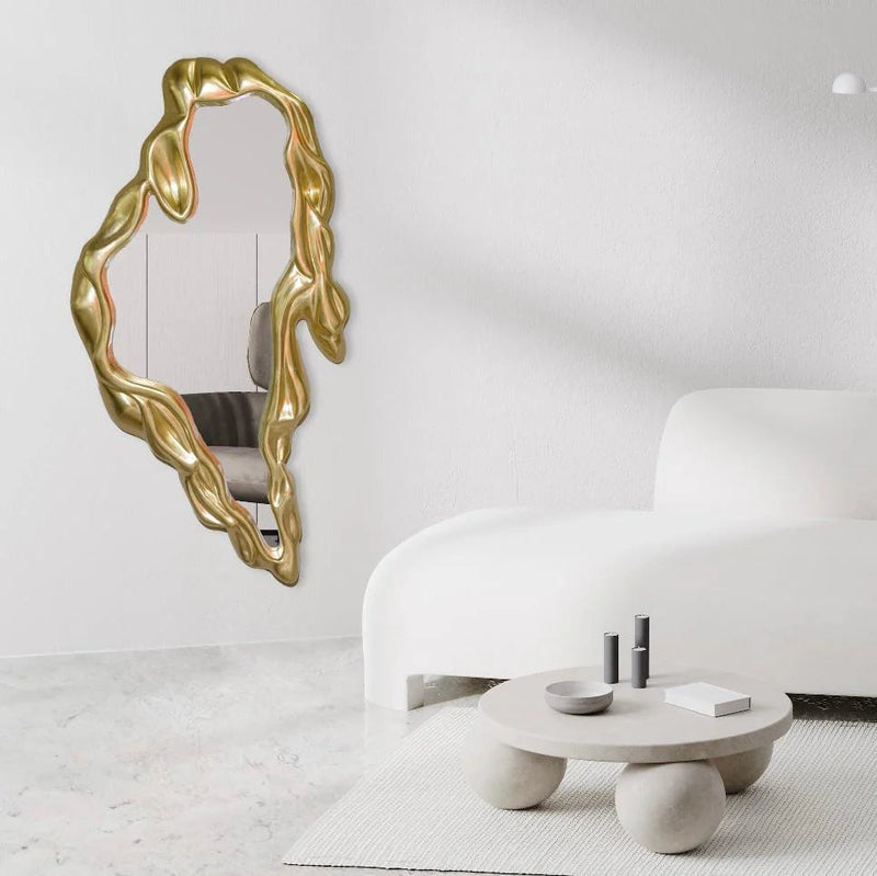 מראה בעלת נוכחות עדינה אך ייחודית, עם מסגרת בגוון זהב רך בעיצוב חופשי וזורם בסגנון הצייר סלבדור דאלי. הצורה הלא סימטרית מעניקה לה מראה אמנותי וחמים, כזה שמוסיף לחלל תחושת תנועה ואור טבעי.