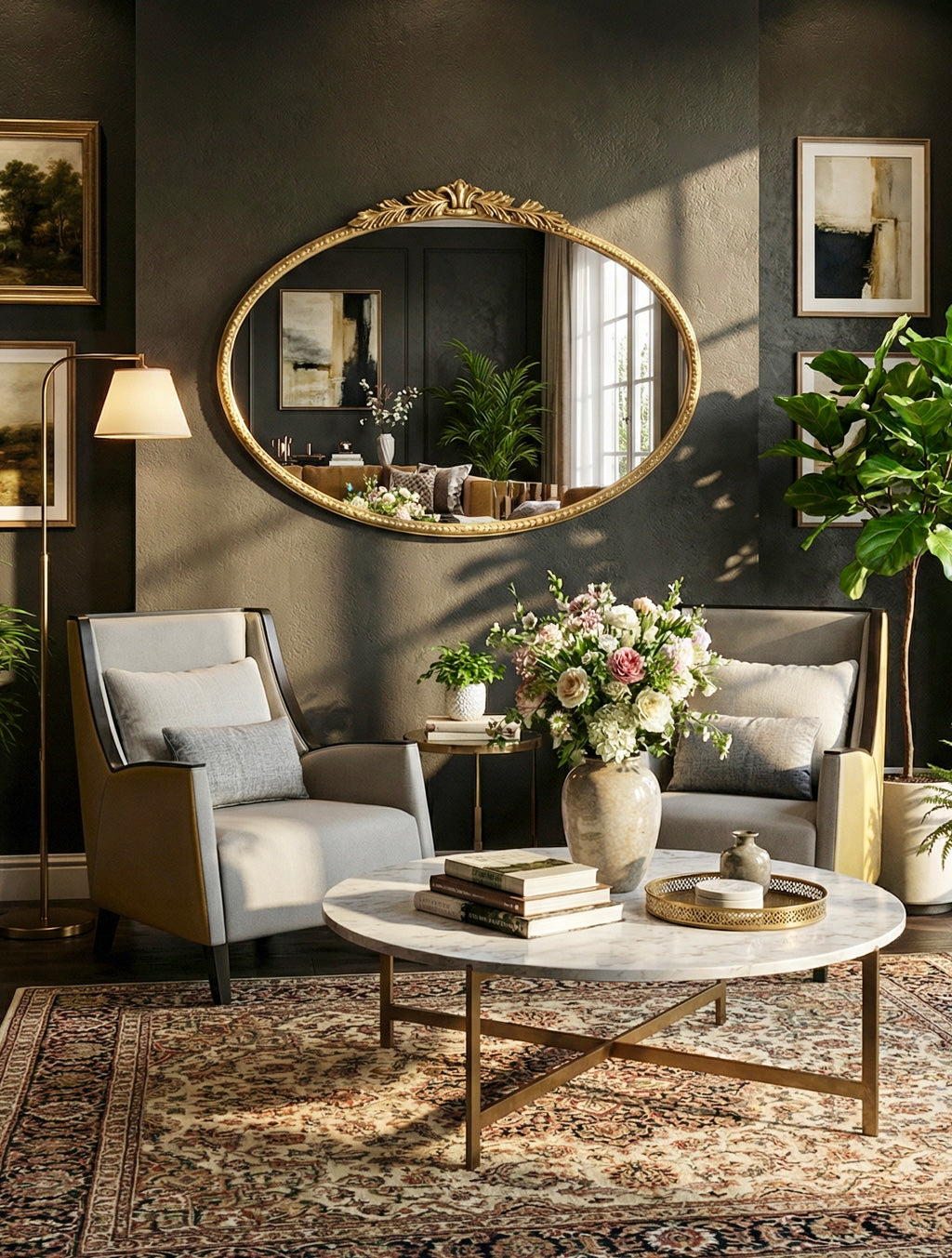 מראה אובלית בעלת נוכחות מעודנת ואלגנטית, עם מסגרת דקה בגוון זהב ואלמנט עיטורי עדין בחלקה העליון. העיצוב הקלאסי משתלב בהרמוניה עם חללים מודרניים ויוצר תחושת עידון ויוקרה רכה.