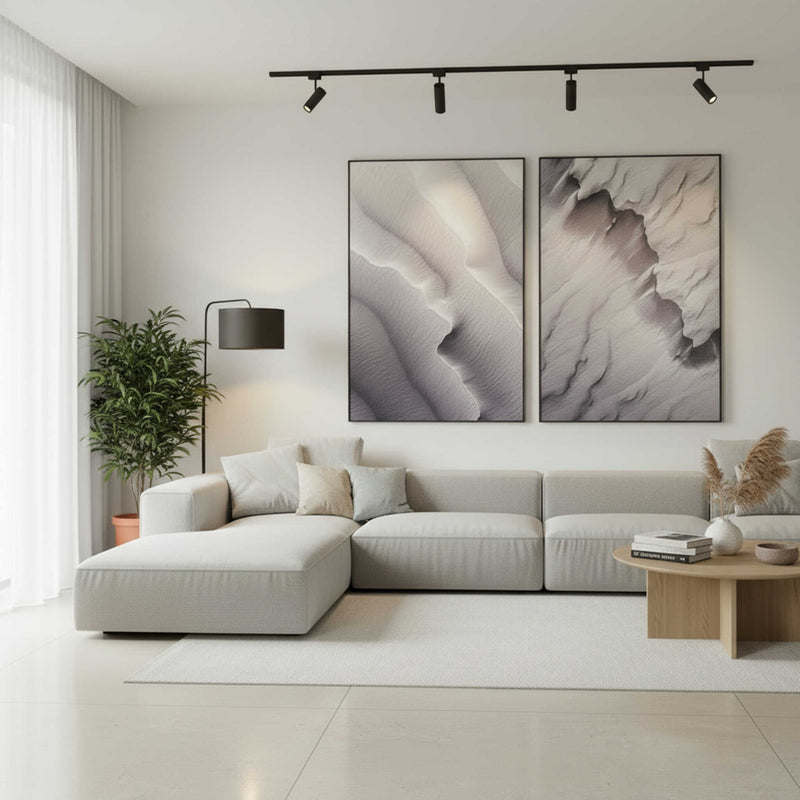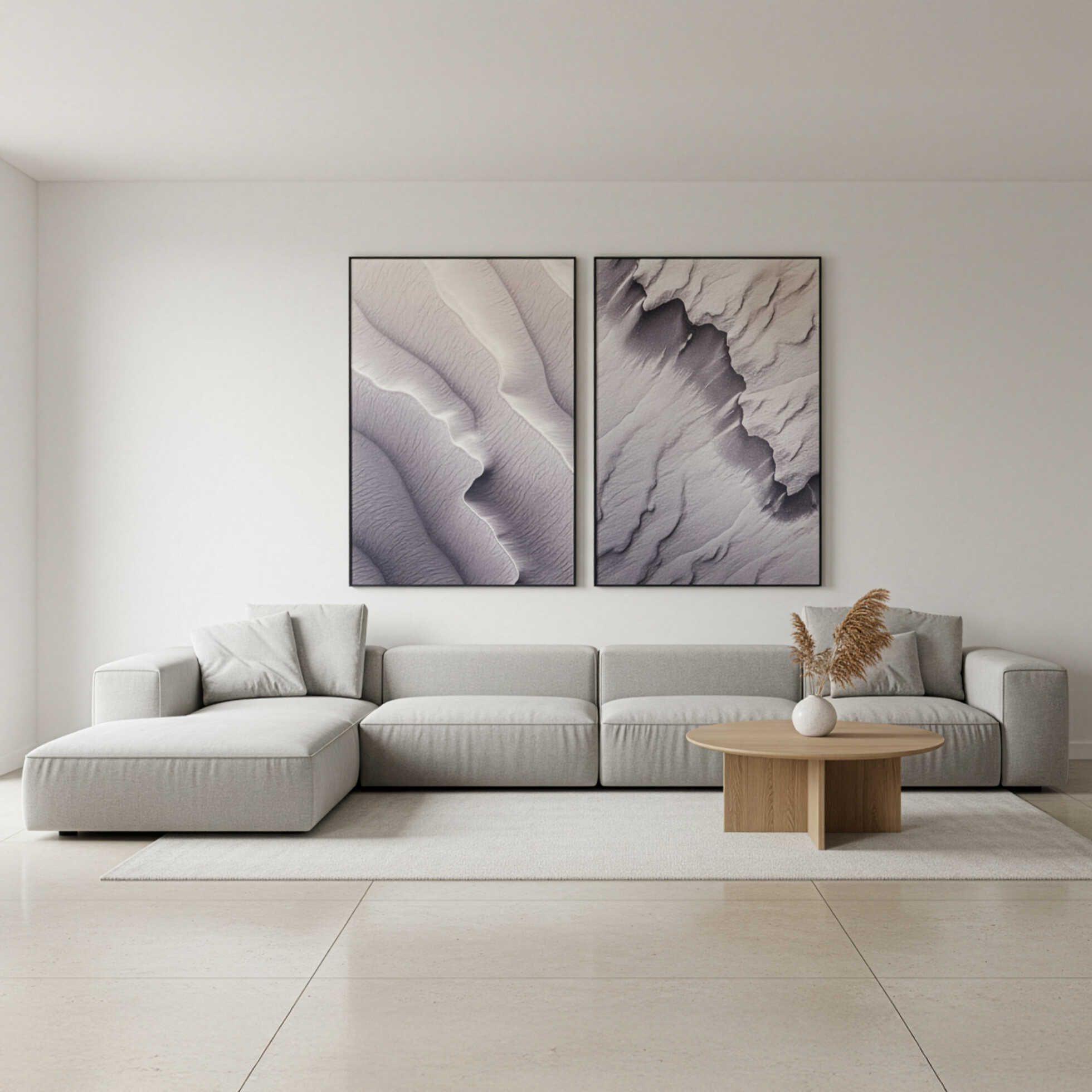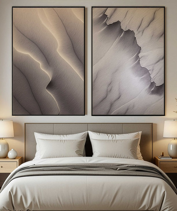 זוג תמונות קיר בעיצוב מופשט בהשראת צורות נוף וטקסטורות טבעיות. הגוונים האפרפרים בשילוב משחקי אור וצל יוצרים מראה אלגנטי וייחודי, המעניק תחושת עומק ורוגע עיצובי.