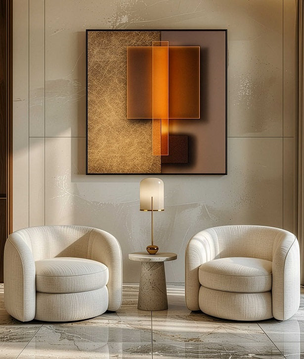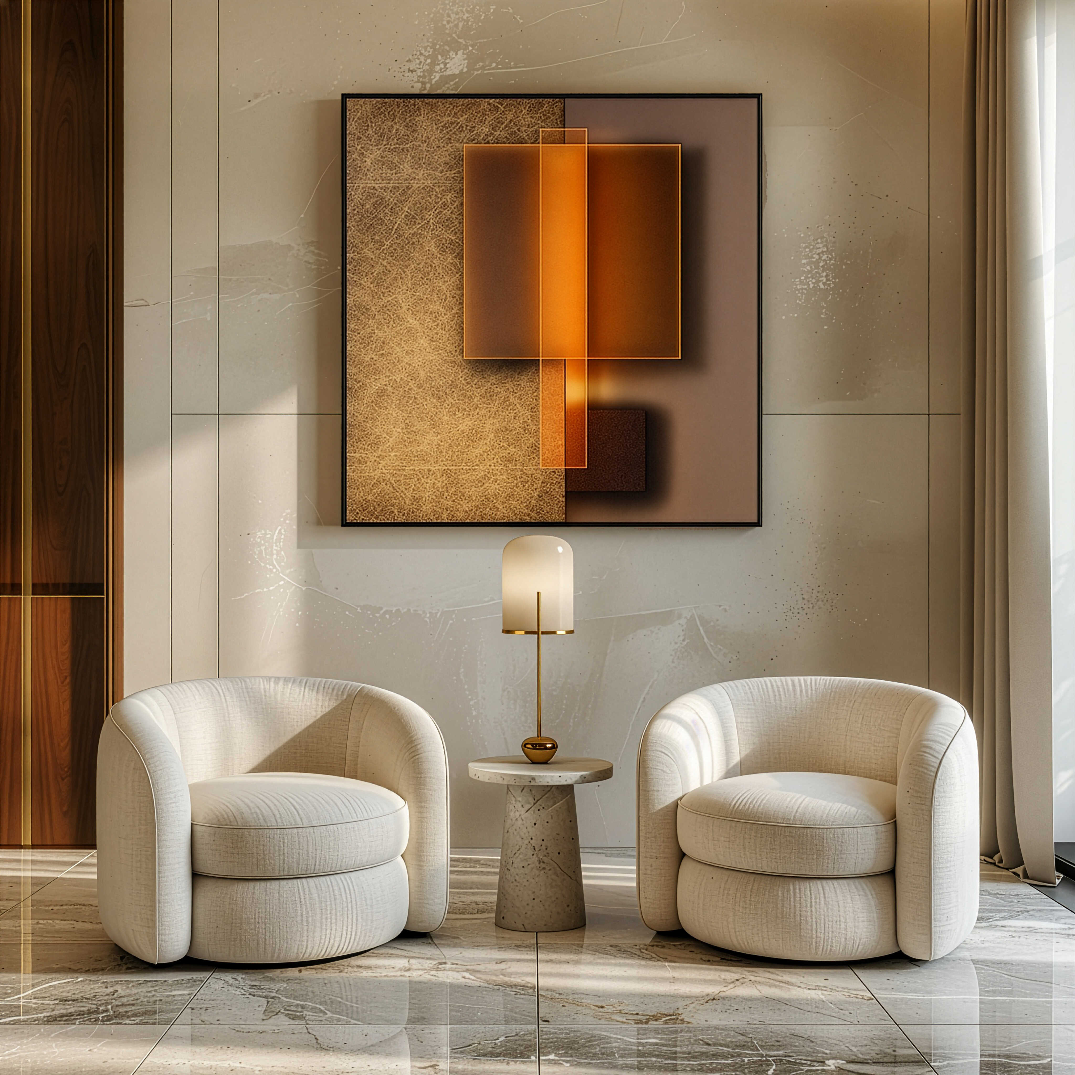 זוג תמונות קיר בגווני חום, זהב ובז' עם קומפוזיציה גיאומטרית ייחודית. השילוב בין טקסטורות שונות וגוונים חמים מעניק מראה אמנותי ואלגנטי המתאים לעיצוב עכשווי.