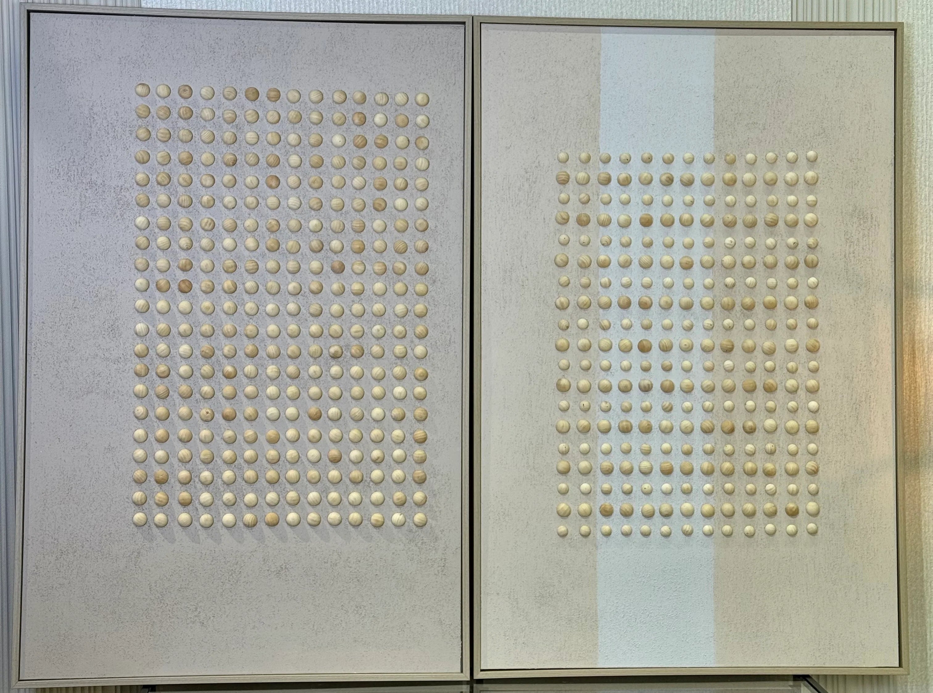 זוג תמונות קיר מודרניות בגווני בז' עם עיטורי כדורי עץ טבעי . העיצוב הגרפי בשילוב הטקסטורה התלת־ממדית יוצר מראה אמנותי ומעניק תחושת עומק וייחודיות.