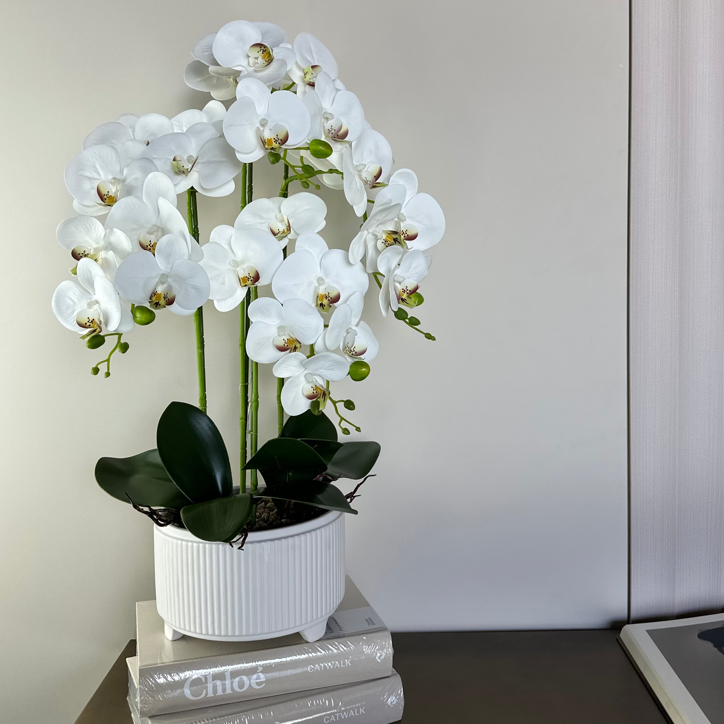 עציץ סחלבים 70 ס"מ בכלי לבן פרח שילוב ירוק