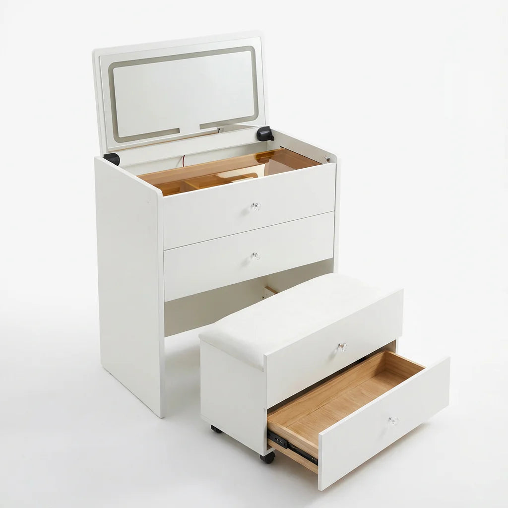 החלק העליון נפתח וחושף מראה אינטגרלית עם תאורת לד מובנית, והחלק התחתון נשלף והופך לכיסא ישיבה תואם. מגירות האחסון מאפשרות סדר מושלם לאיפור, אביזרים, תכשיטים ופריטים אישיים – הכול במקום אחד, בלי עומס ובלי פשרות על עיצוב.