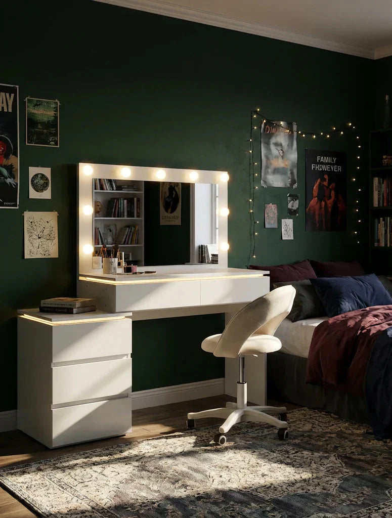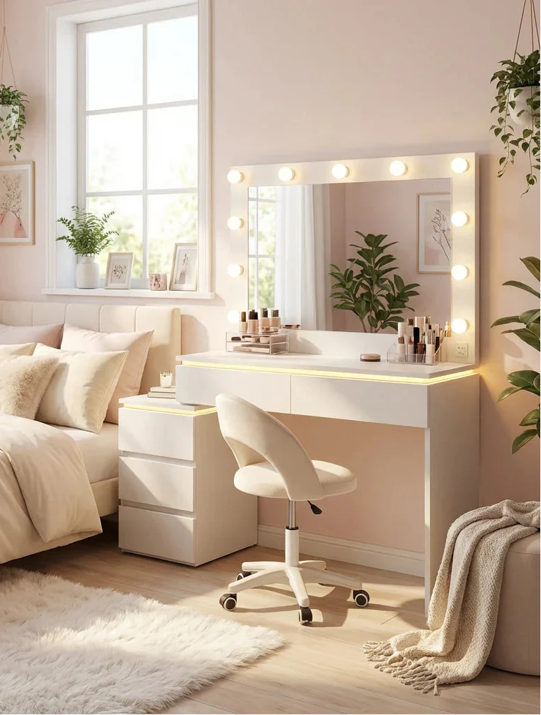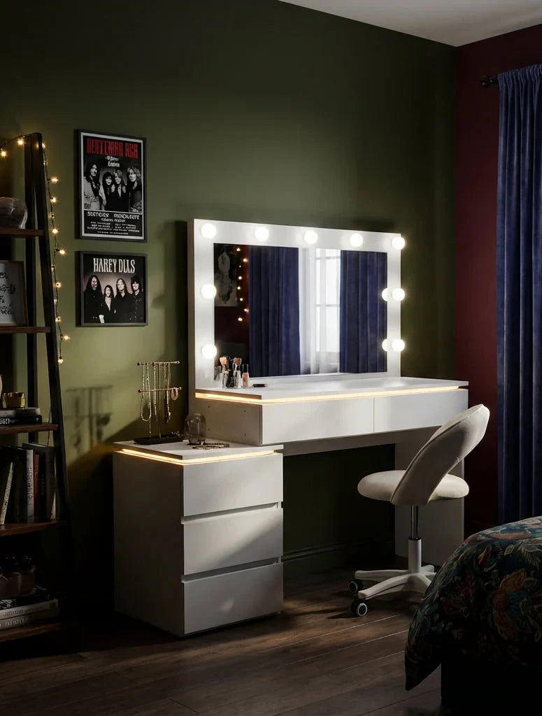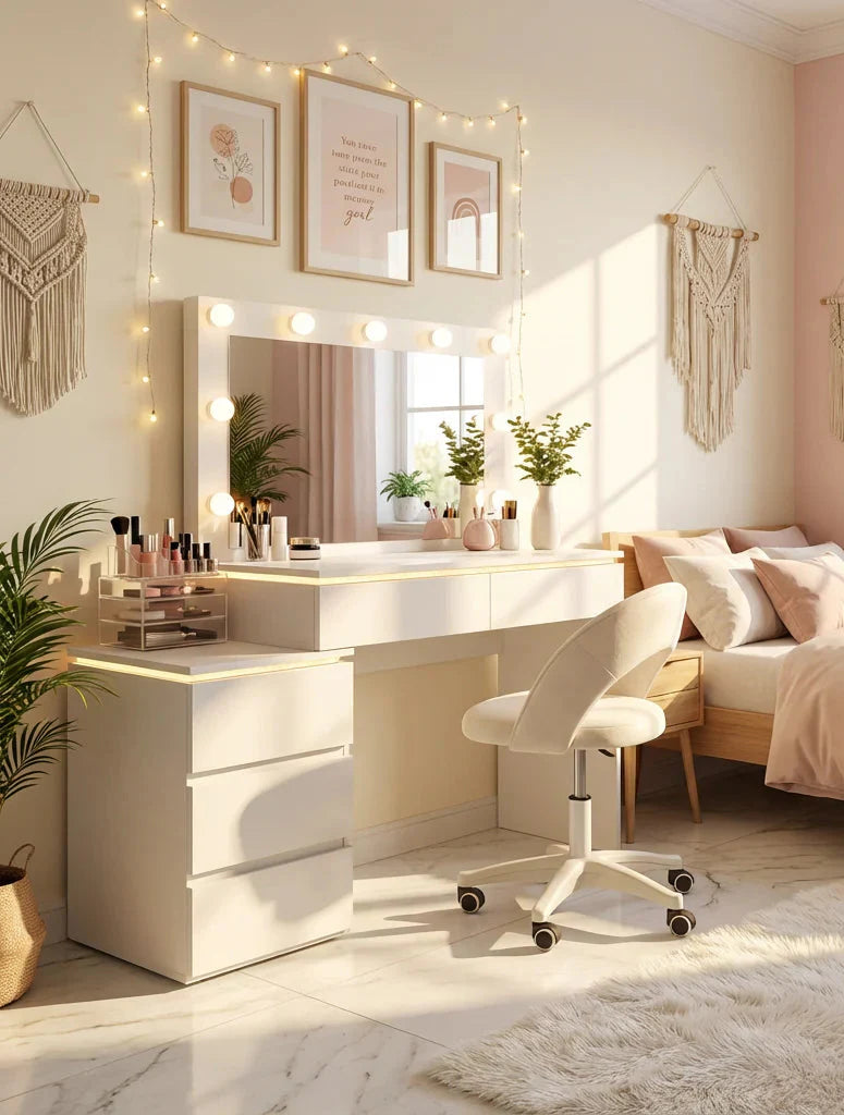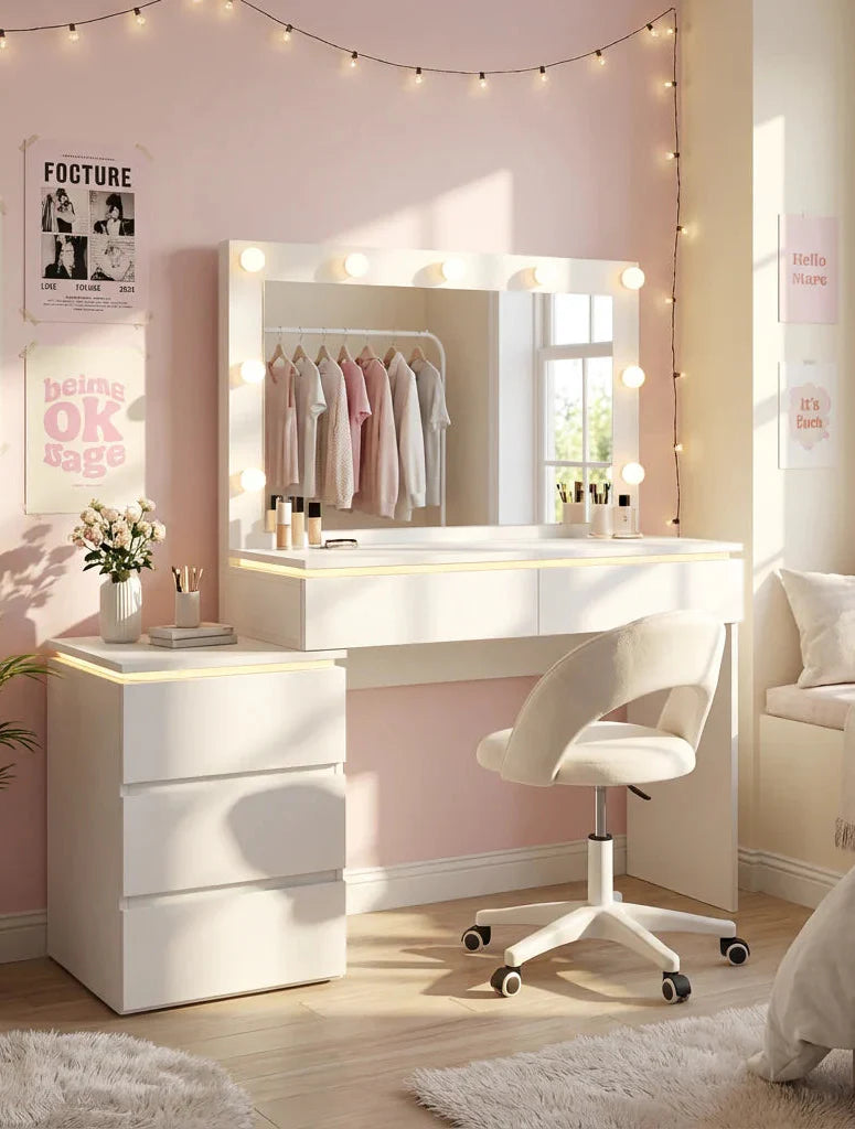 פינת איפור מעוצבת ועדינה, שתוכננה במיוחד לחדרי ילדות ונערות ולחללים קטנים. שילוב מושלם בין עיצוב אלגנטי לפונקציונליות חכמה - מראה מוארת, משטח עבודה נוח ואחסון מסודר, הכול ביחידה קומפקטית ונקייה שמוסיפה סטייל ורכות לחדר.