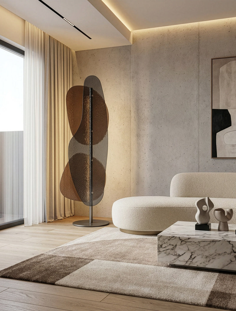 פריט דקורטיבי עוצמתי המשלב זכוכיות אמנותיות בגווני חום עמוקים עם בסיס מתכת מינימליסטי, ליצירת נוכחות עיצובית אלגנטית ומודרנית. הפסל מעניק עומק, תנועה ואור לחלל, ומשתלב באופן טבעי בעיצובי סלון, פינות ישיבה, מבואות כניסה או חללים מעוצבים של מעצבים ואדריכלים.