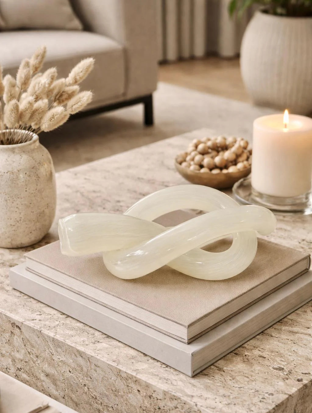 פסל קשר בגוון שמנתי עם ברק עדין שמוסיף טאץ’ יוקרתי ומודרני לעיצוב הבית. זהו פריט מושלם של פריטי נוי לבית שמכניס נוכחות אלגנטית בלי להעמיס.