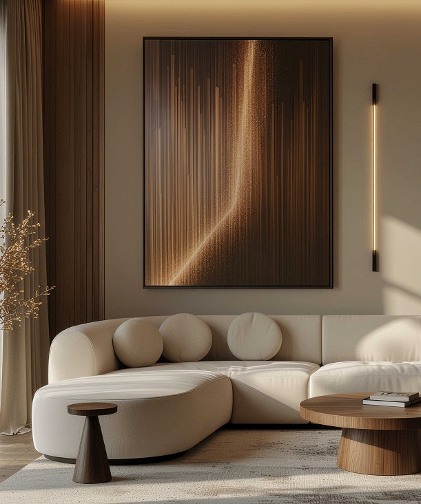 תמונה ייחודית בגווני חום במשחקי 'אור וצל' עם אפקט זוהר במרכז, היוצר מראה יוקרתי ומלא נוכחות. הניגוד בין הגוונים הכהים לנצנוץ הבהיר מוסיף מימד דרמטי ומודרני.