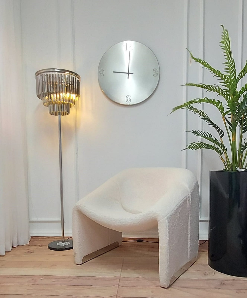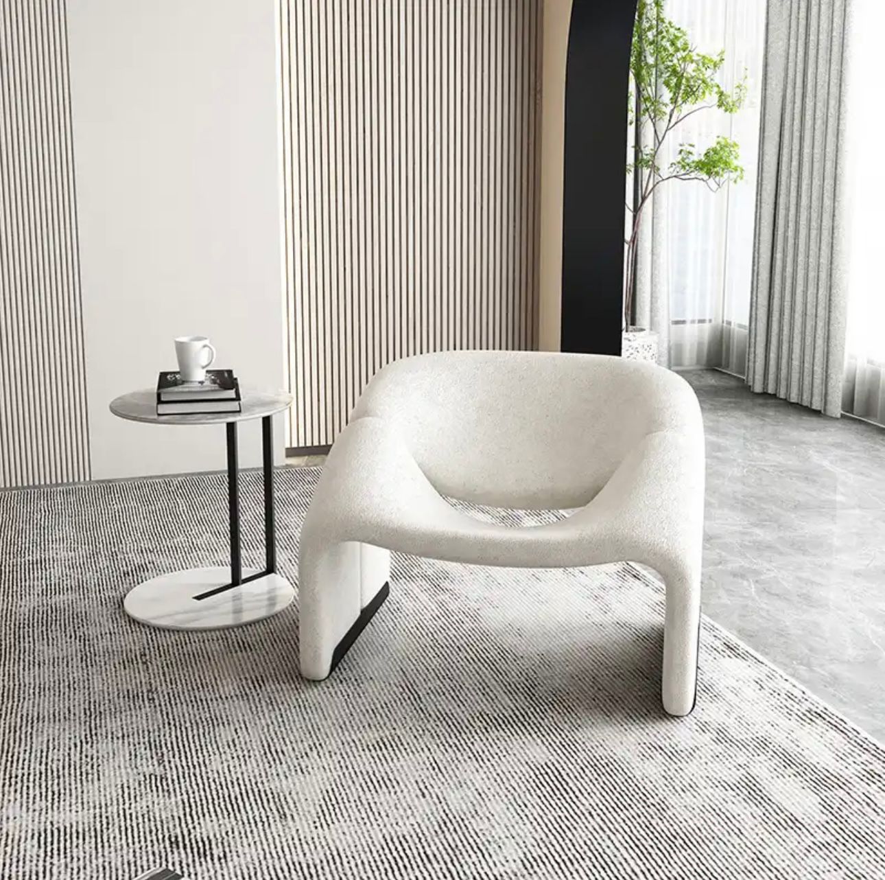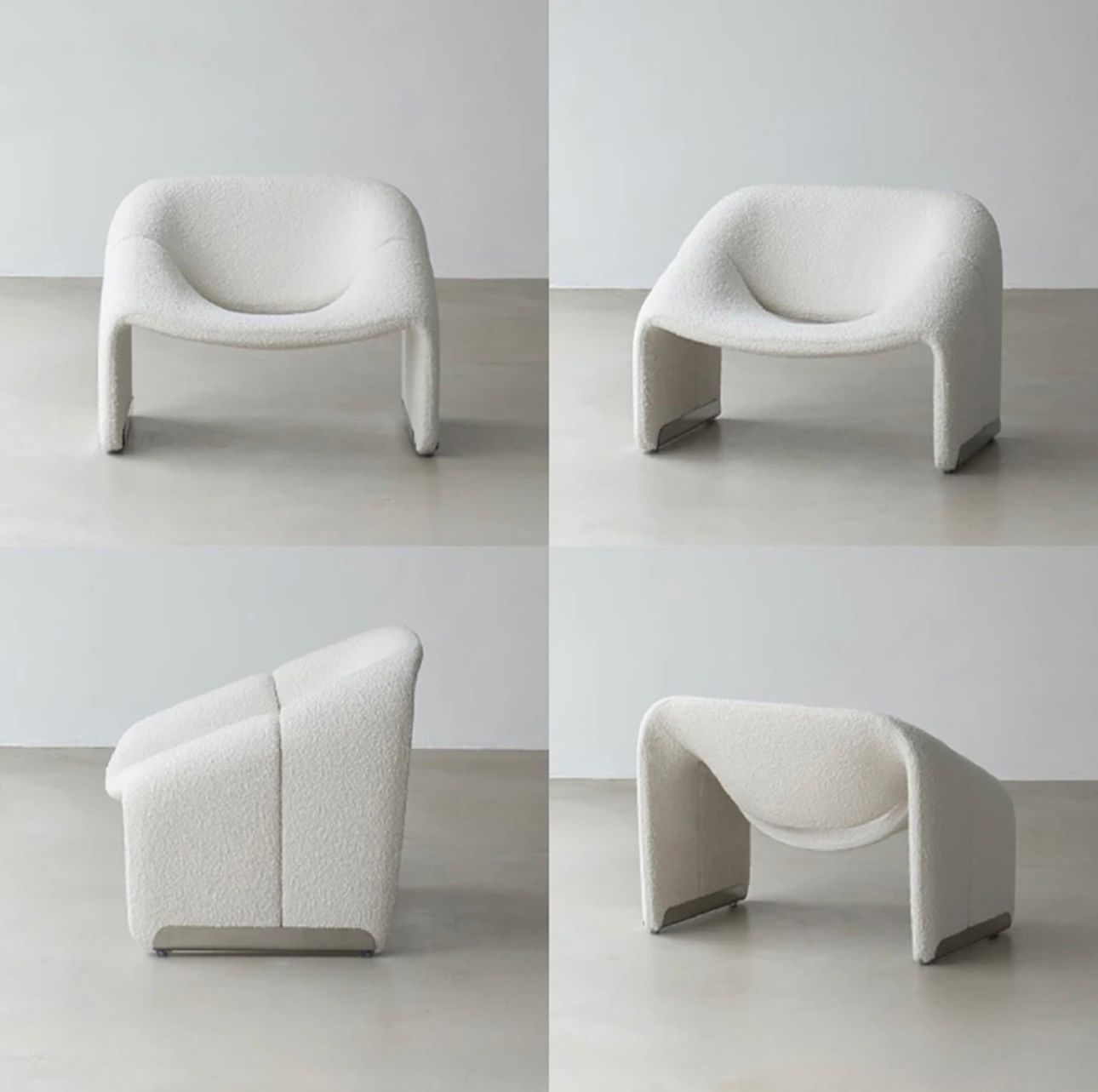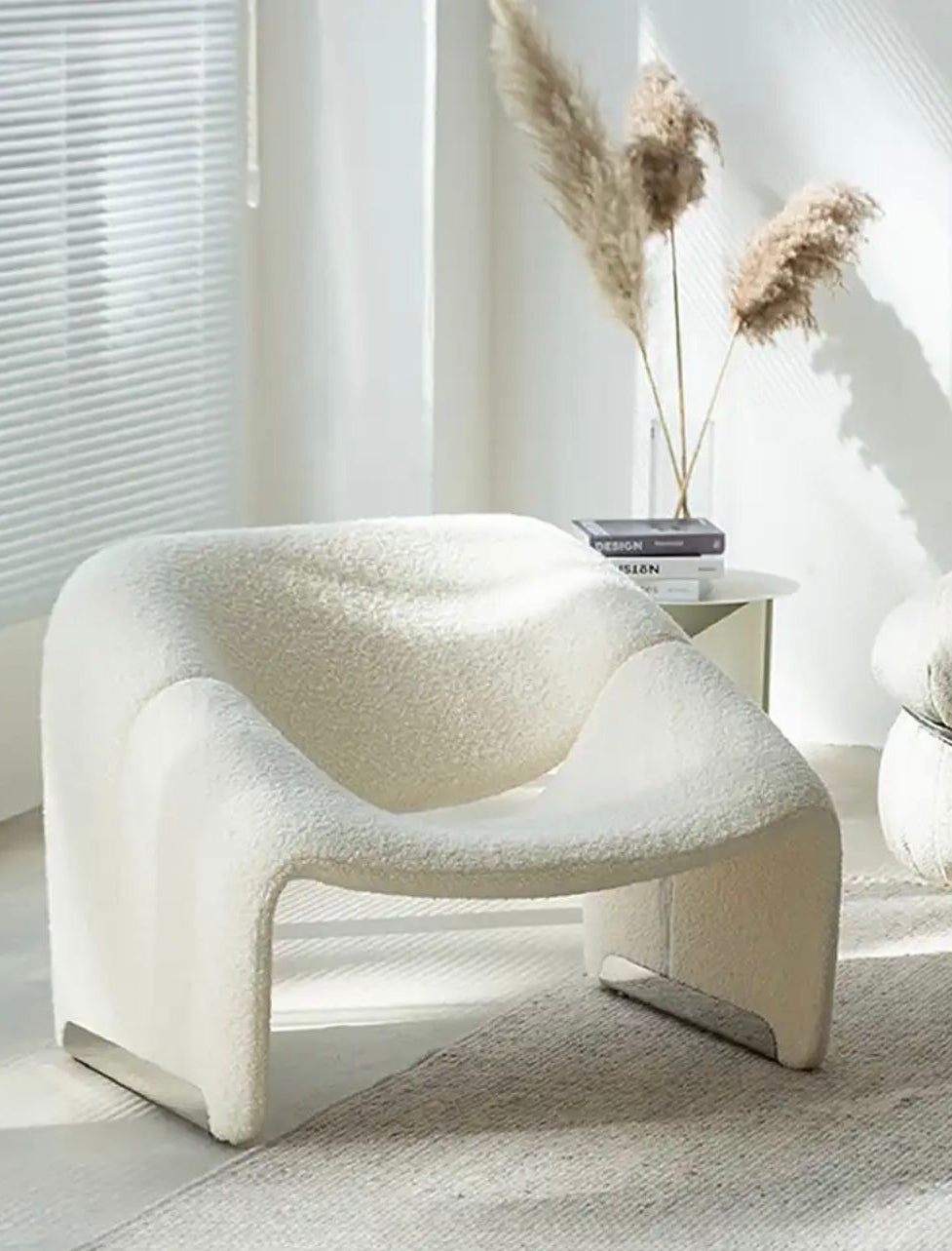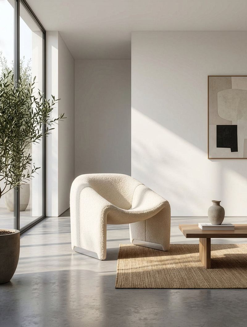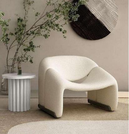 הכורסה המעוצבת מבד בוקלה משלבת בין מבנה פיסולי רך לבין אסתטיקה מודרנית מינימליסטית, ויוצרת פריט עיצוב שמרגיש כמו יצירת אמנות בתוך הבית. הקווים המעוגלים והמבנה הזורם מעניקים לה מראה ייחודי, בעוד בד הבוקלה הרך מוסיף עומק טקסטורלי וחמימות לחלל.
