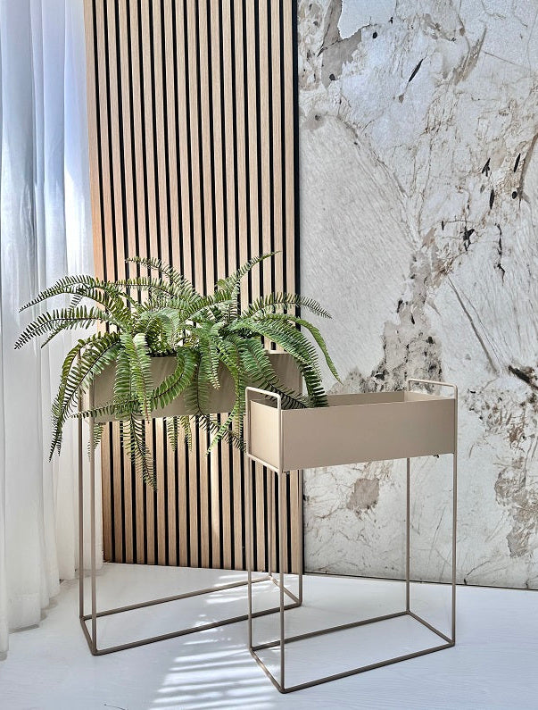 זוג מעמדי דקורציה ממתכת בצבע קפה נועדו להדגיש פריטי נוי, צמחים או פסלים בצורה אלגנטית ומדויקת, ולהוסיף גובה ונוכחות לעיצוב החלל.