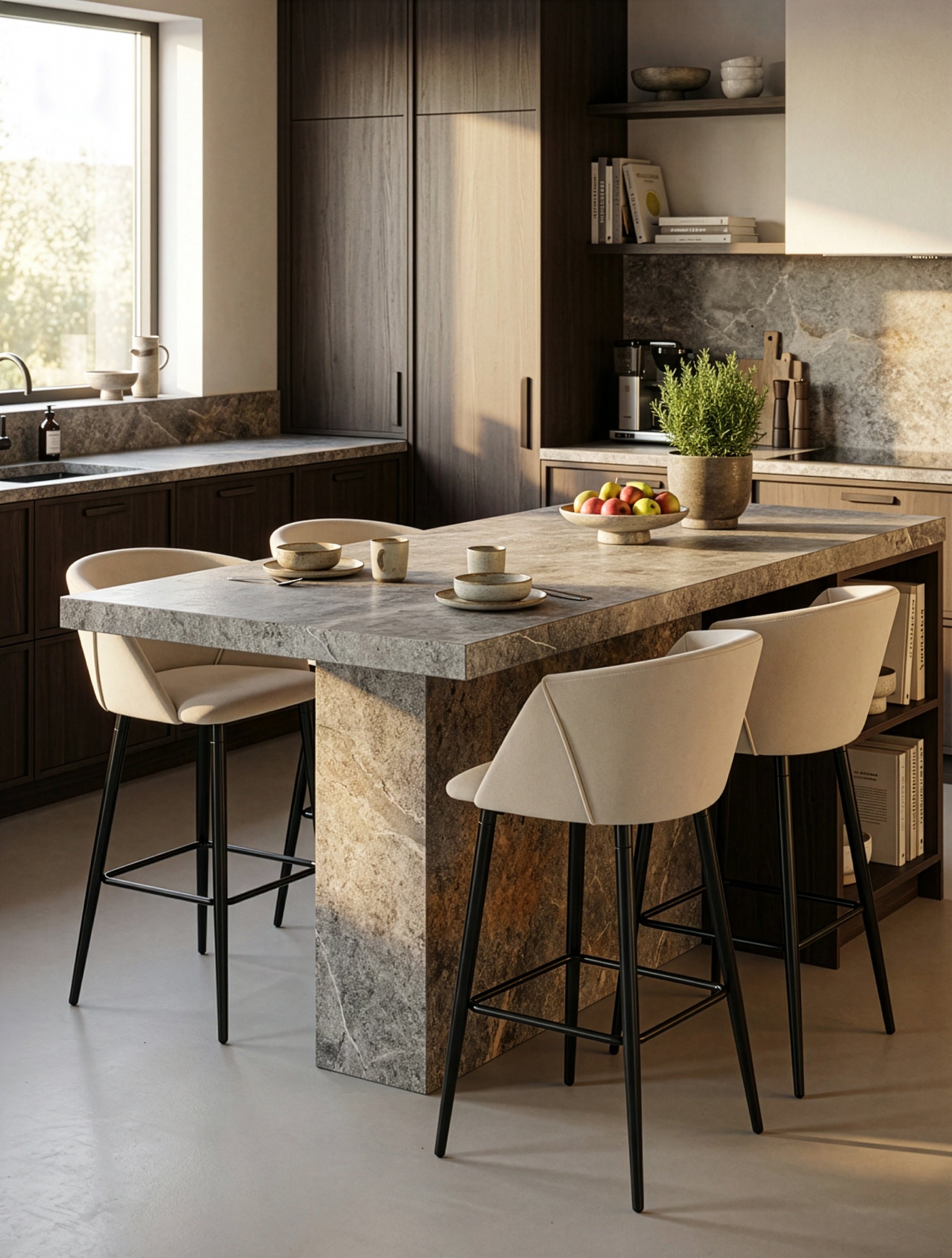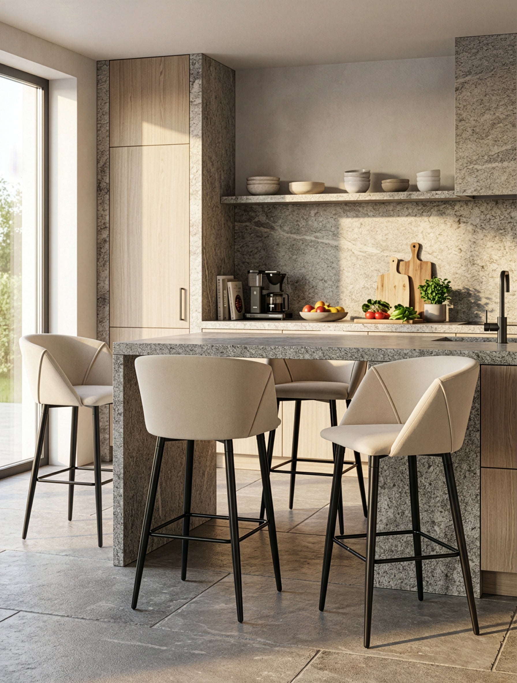 כיסא בר בצבע אבן דגם נואר אלגנטי בעיצוב עכשווי, המאופיין בקווים רכים ובפרופורציות מדויקות.