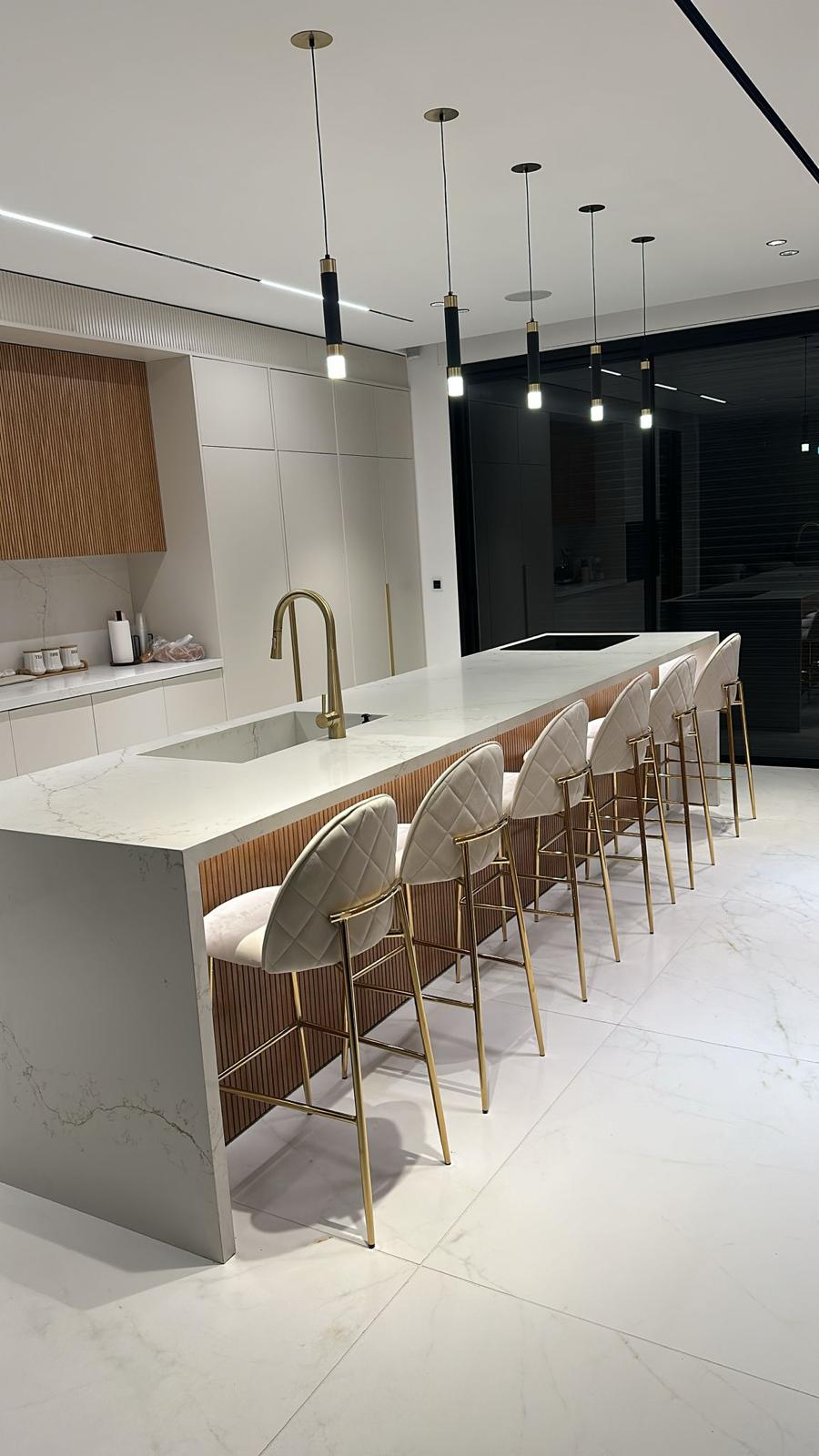 כיסא בר המעוצב בקו נקי ומעודן, המשלב בין יוקרה מודרנית לנוחות מרבית.