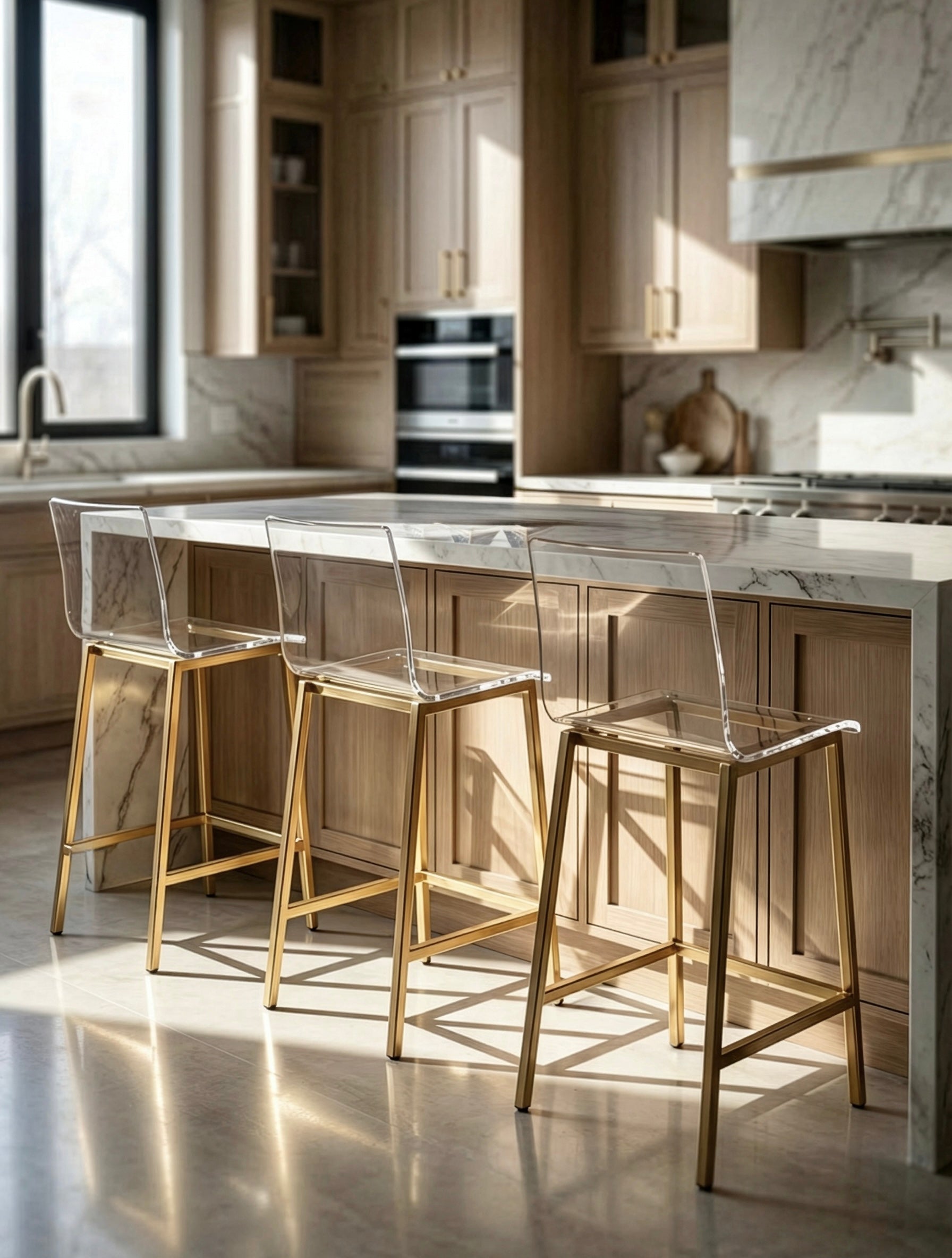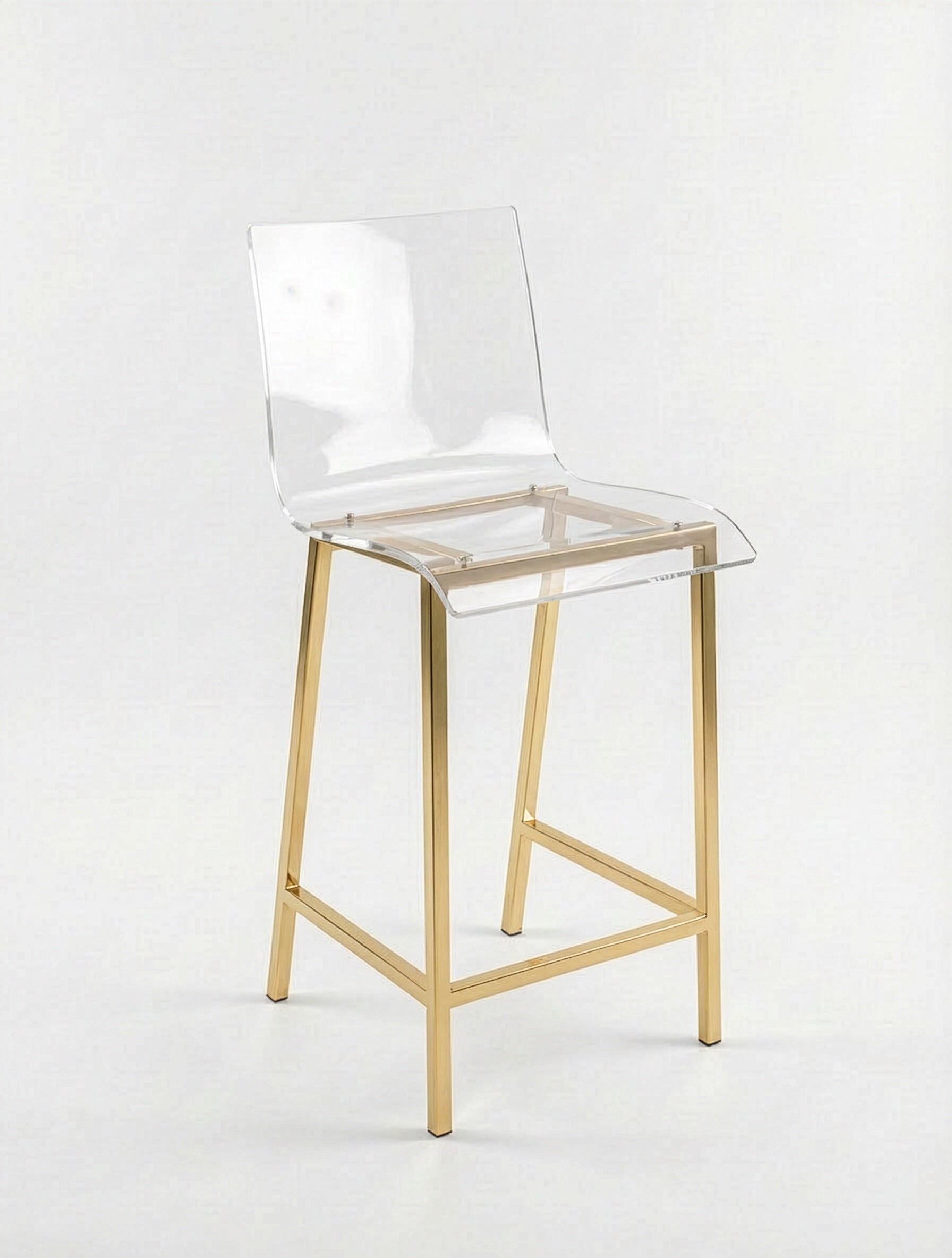 כיסא בר AURA – שקיפות אולטרה־יוקרתית עם בסיס מתכת בגימור זהב