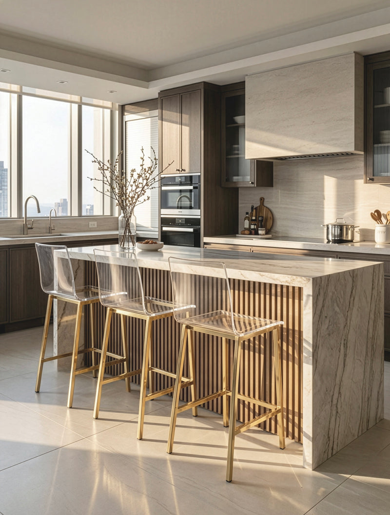 כיסא הבר AURA הוא בדיוק הפריט שמכניס למטבח את ה״וואו״ שמרגישים מיד: מושב וגב שקופים במראה נקי ומרחף, יחד עם בסיס מתכת יוקרתי בגימור זהב, שיוצר מראה של חלל פתוח, מואר ומדויק. זהו כיסא בר מעוצב שנראה כמו פריט גלריה, אבל נשאר פרקטי ונוח ליום־יום.