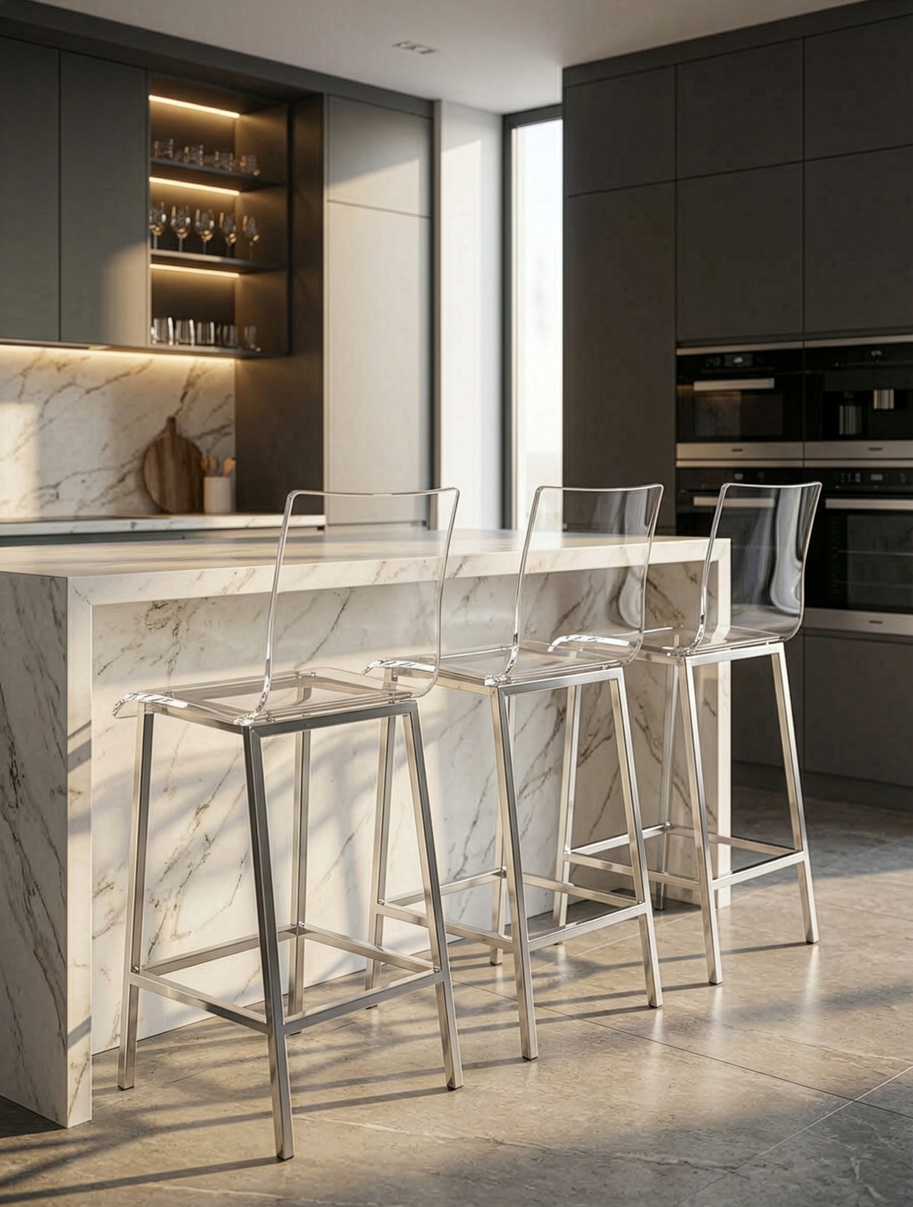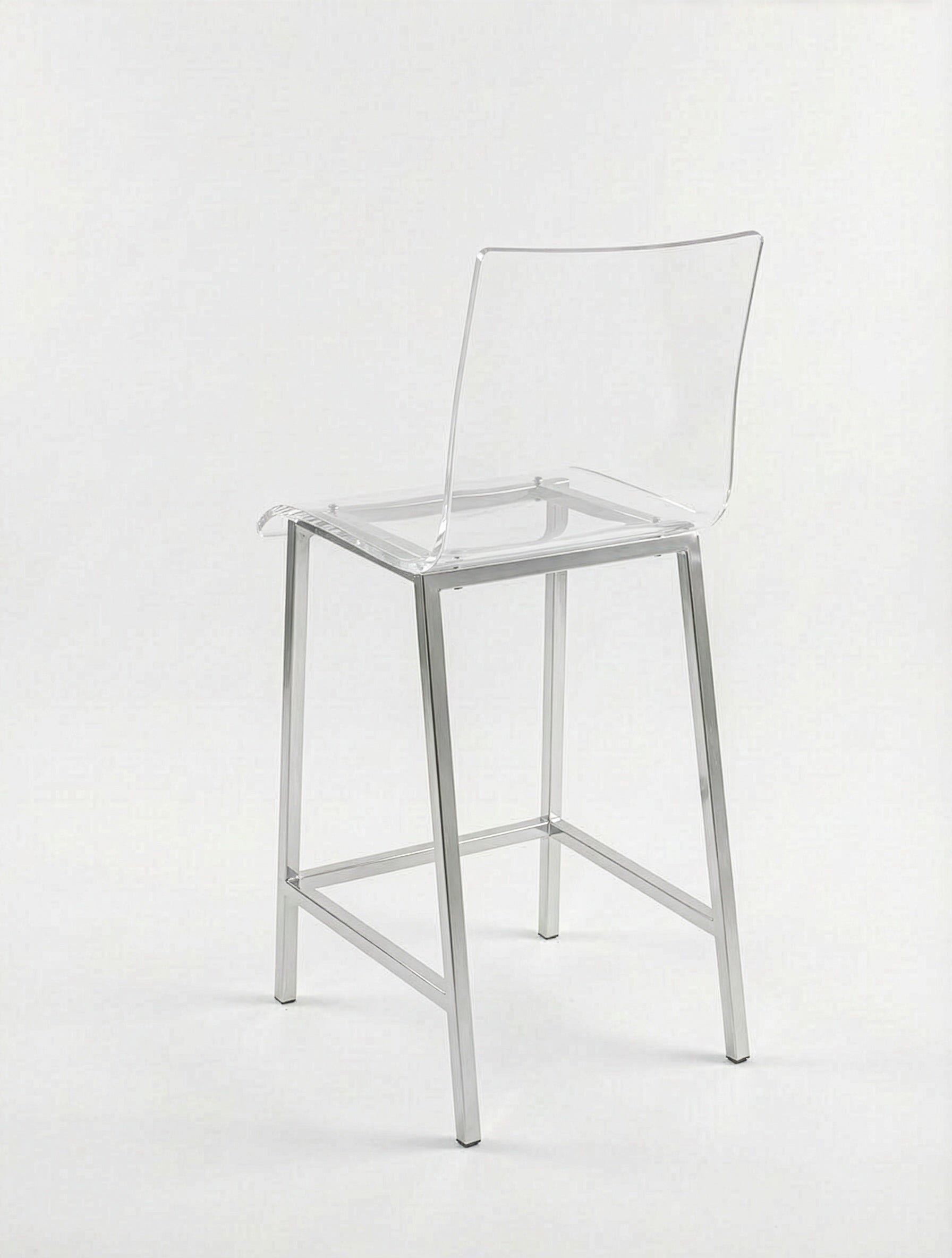 כיסא בר AURA – שקיפות אולטרה־יוקרתית עם בסיס מתכת בגימור כסף