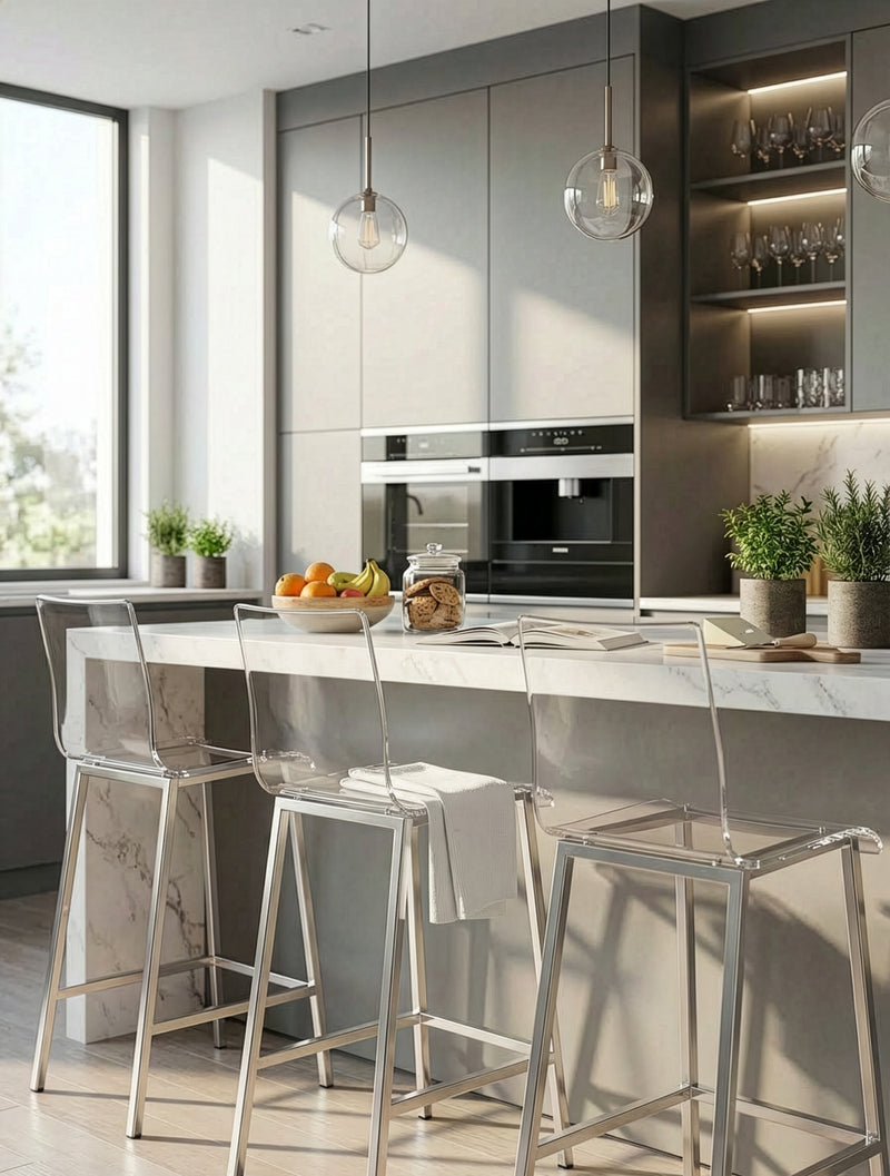 כיסא הבר AURA הוא בדיוק הפריט שמכניס למטבח את ה״וואו״ שמרגישים מיד: מושב וגב שקופים במראה נקי ומרחף, יחד עם בסיס מתכת יוקרתי בגימור כסוף, שיוצר מראה של חלל פתוח, מואר ומדויק. זהו כיסא בר מעוצב שנראה כמו פריט גלריה, אבל נשאר פרקטי ונוח ליום־יום.