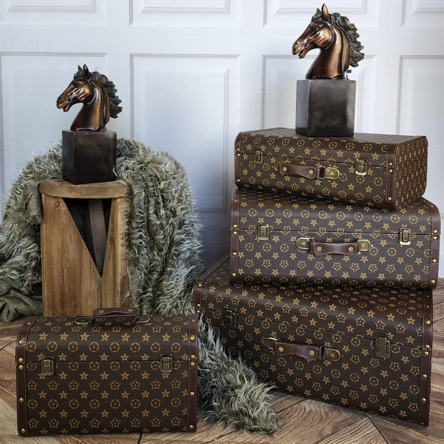 סט 4 תיבות אחסון דקורטיביות בעיצוב וינטג’ יוקרתי, בהשראת מזוודות קלאסיות, בגימור חום עם הדפס אלגנטי. פריט פונקציונלי ודקורטיבי המשלב אחסון עם נוכחות עיצובית מרשימה, ומתאים לסלון, חדר שינה או פינת ישיבה.