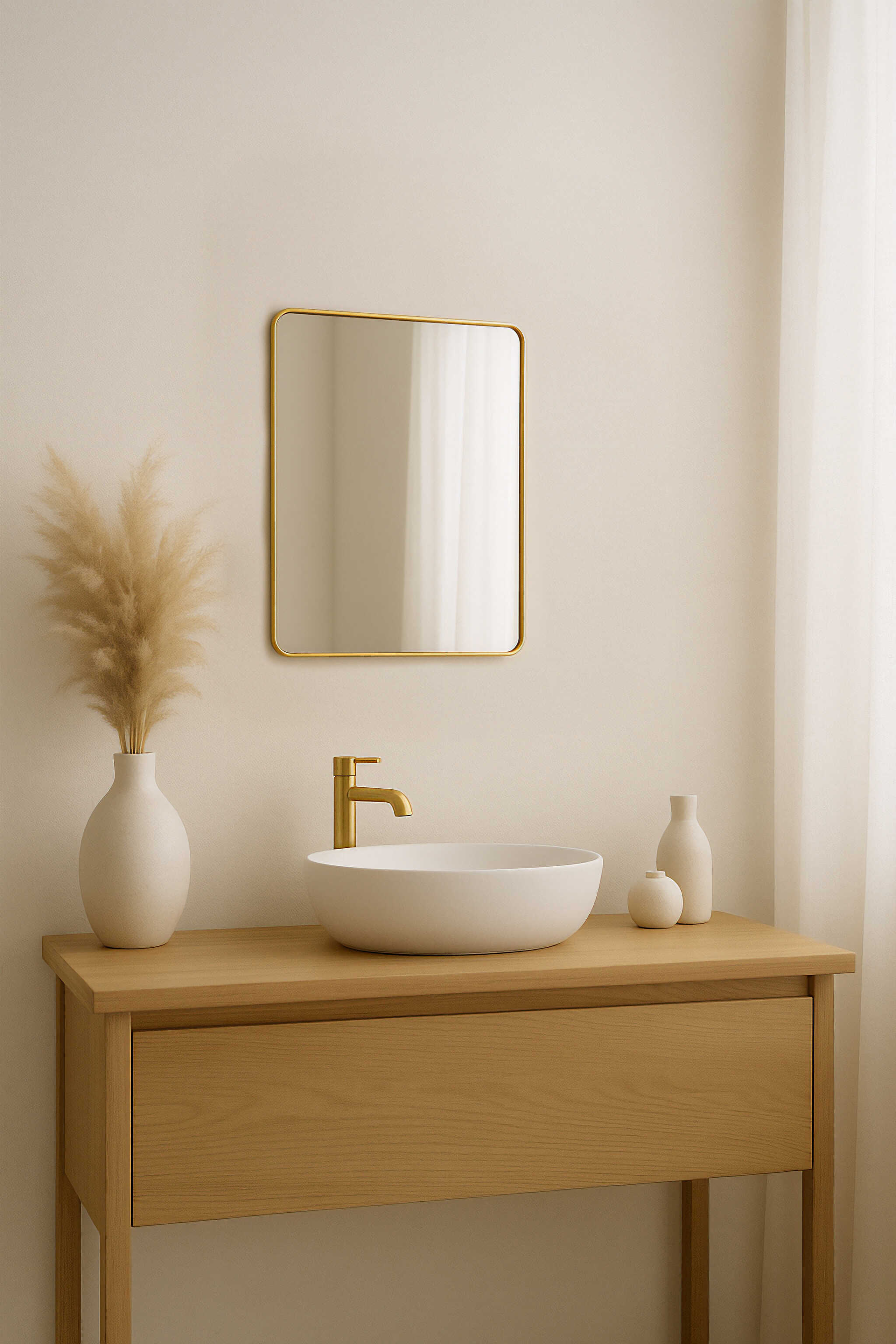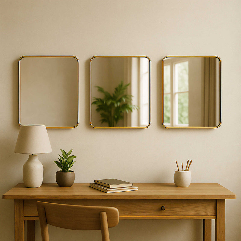 מראה מרובעת-מלבנית בגימור מדויק עם מסגרת דקה בגוון זהב מט, עשויה במבוק איכותי ועמיד במיוחד – מושלמת לחדרי רחצה, מבואות, או כפריט משלים מעל קונסולה.