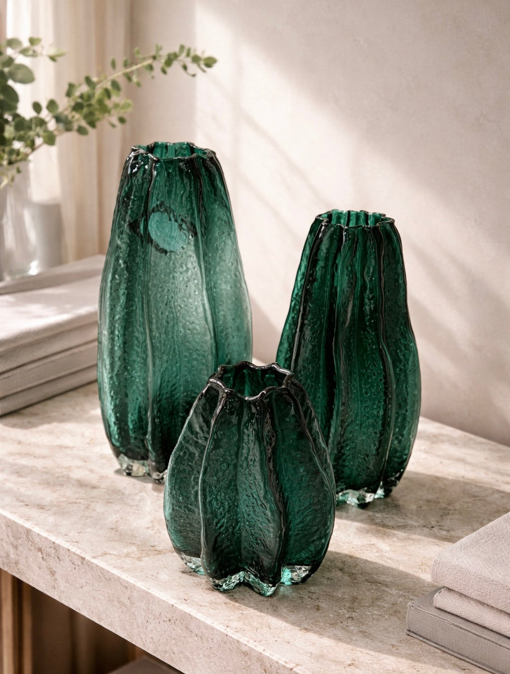 שלישיית האגרטלים הזו היא יצירת אמנות שמשדרגת כל חלל. עם זכוכית ירוקה בגוון עמוק, עיצוב המזכיר עלים או גבעולי צמח מטפס וטקסטורה ייחודית שמוסיפה עניין חזותי, האגרטלים משתלבים בצורה מושלמת בעיצוב מודרני, אורגני או בוהו-שיק.