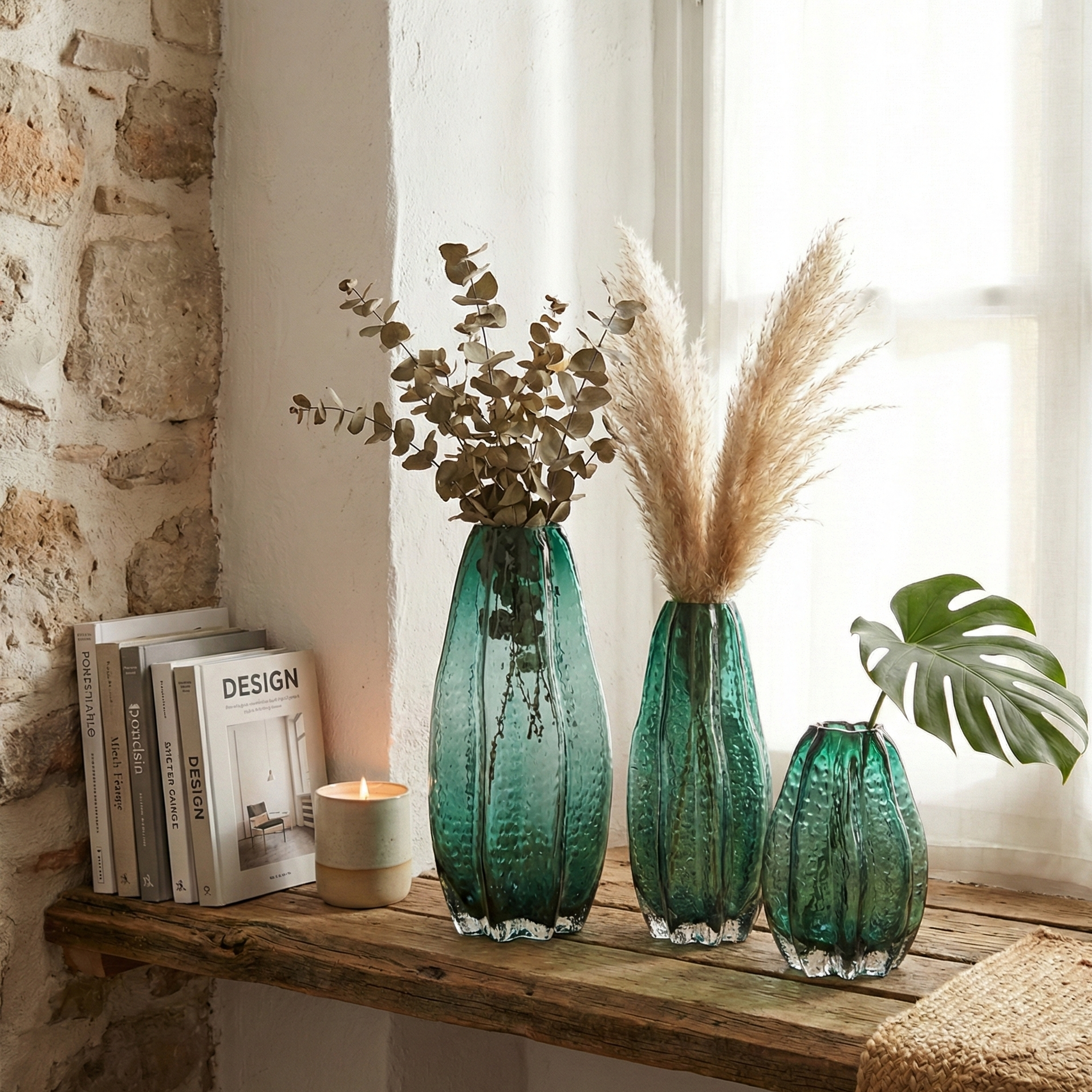 סט 3 אגרטלים זכוכית ירוקה בעיצוב טבעי עם טקסטורה עשירה