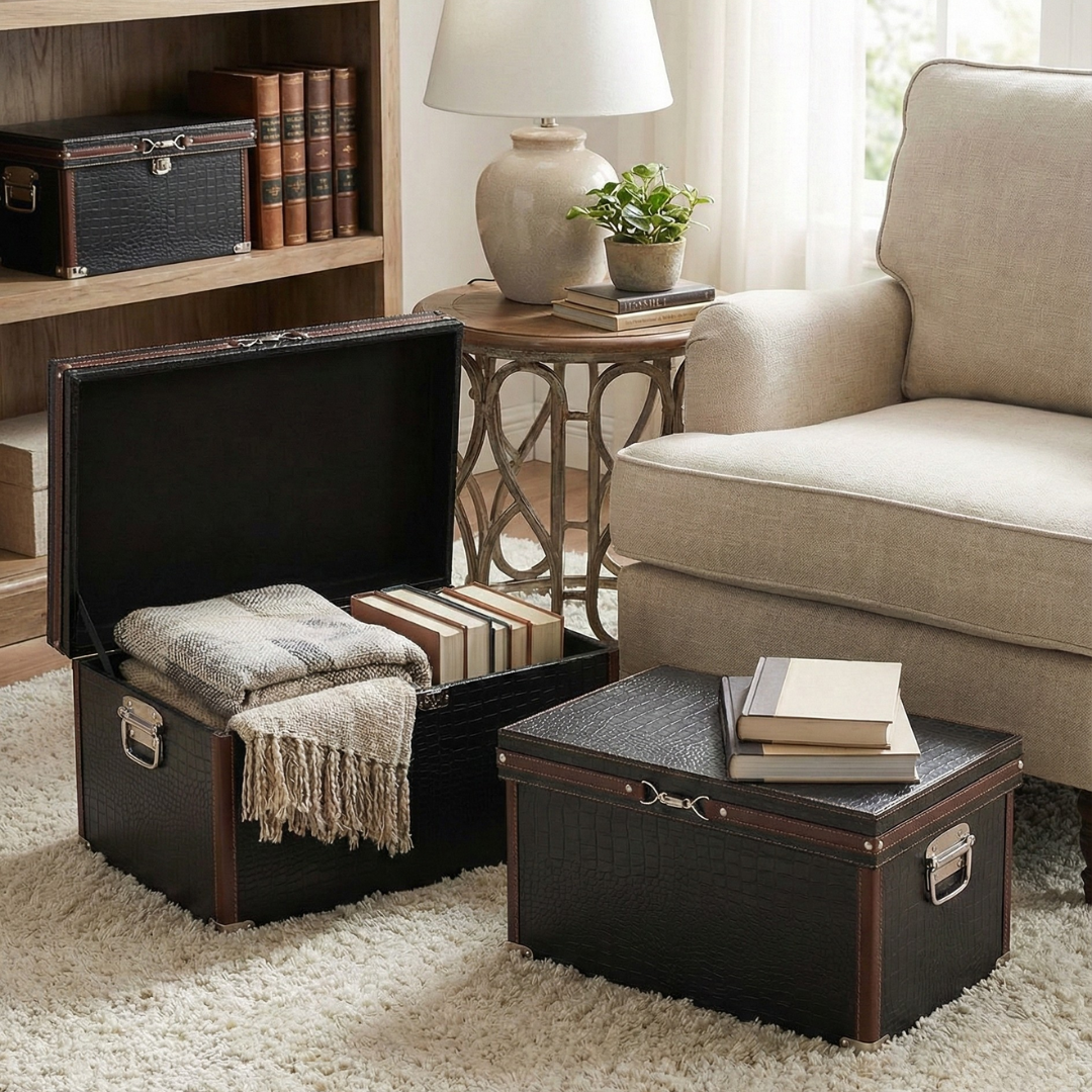 המזוודות האחסון הדקורטיביות הללו הן הבחירה המושלמת לשילוב בין עיצוב ייחודי ופונקציונליות מרשימה. עשויות מחומרים איכותיים עם גימור עור מלאכותי בגוון חום כהה ונגיעות של פרזול מתכתי יוקרתי, הן מוסיפות טאץ’ קלאסי לכל חלל. המזוודות מתאימות לאחסון מגוון פריטים, תוך שמירה על מראה אלגנטי ומסודר.