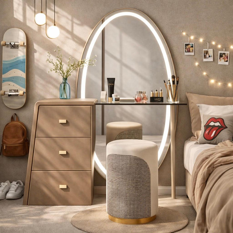 פינת איפור בצבע בז", כוללת מראת גוף עם תאורת לד והדום ישיבה, רוחב עליון של הפינה 110 ס״מ / רוחב החלק התחתון 120 ס״מ / עומק40/ גובה כללי 130 ס״מ .
