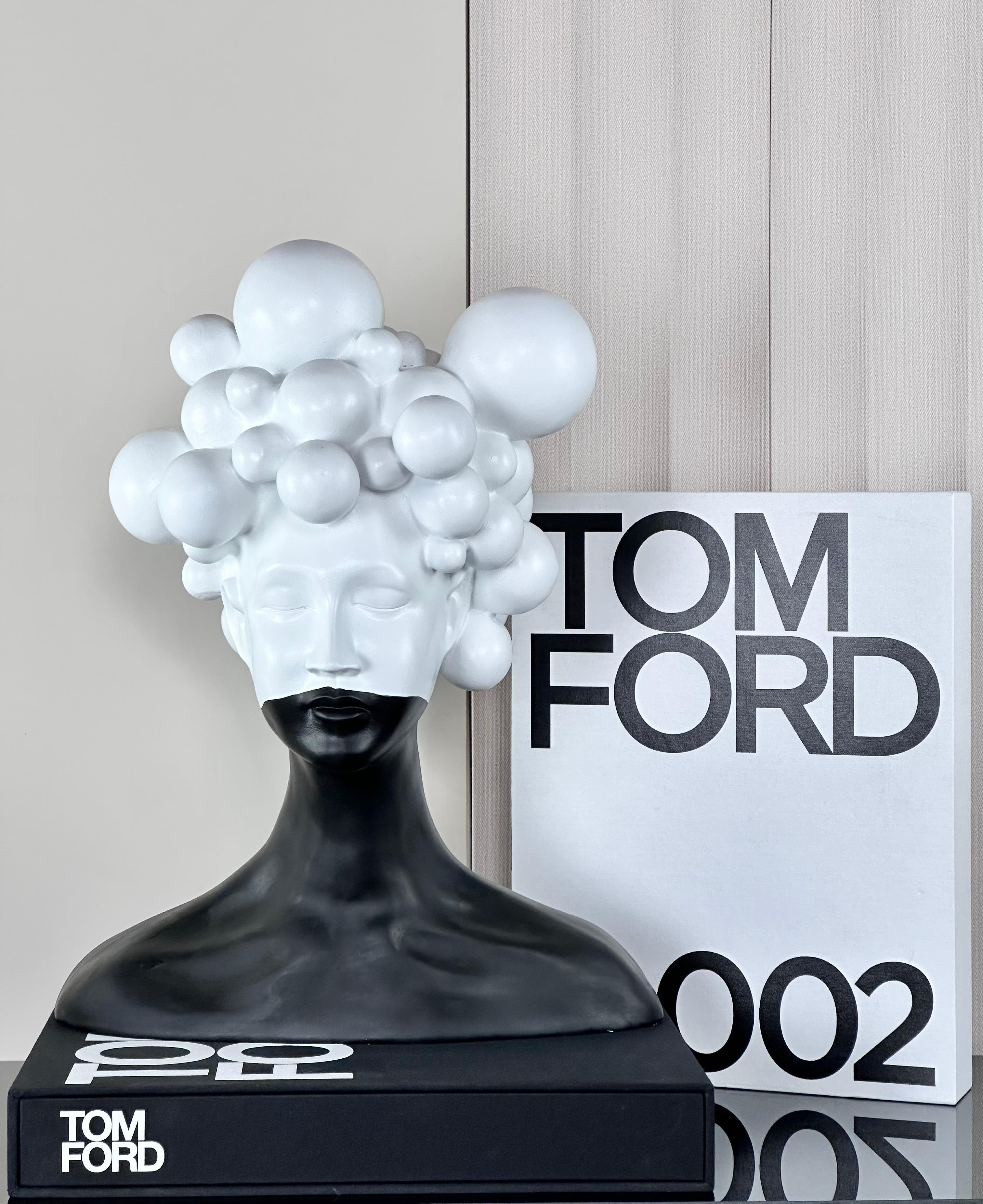 הניגוד בין הצוואר והכתפיים השחורים לבין הפנים והשיער הלבנים יוצר נוכחות עזה ומתוחכמת.