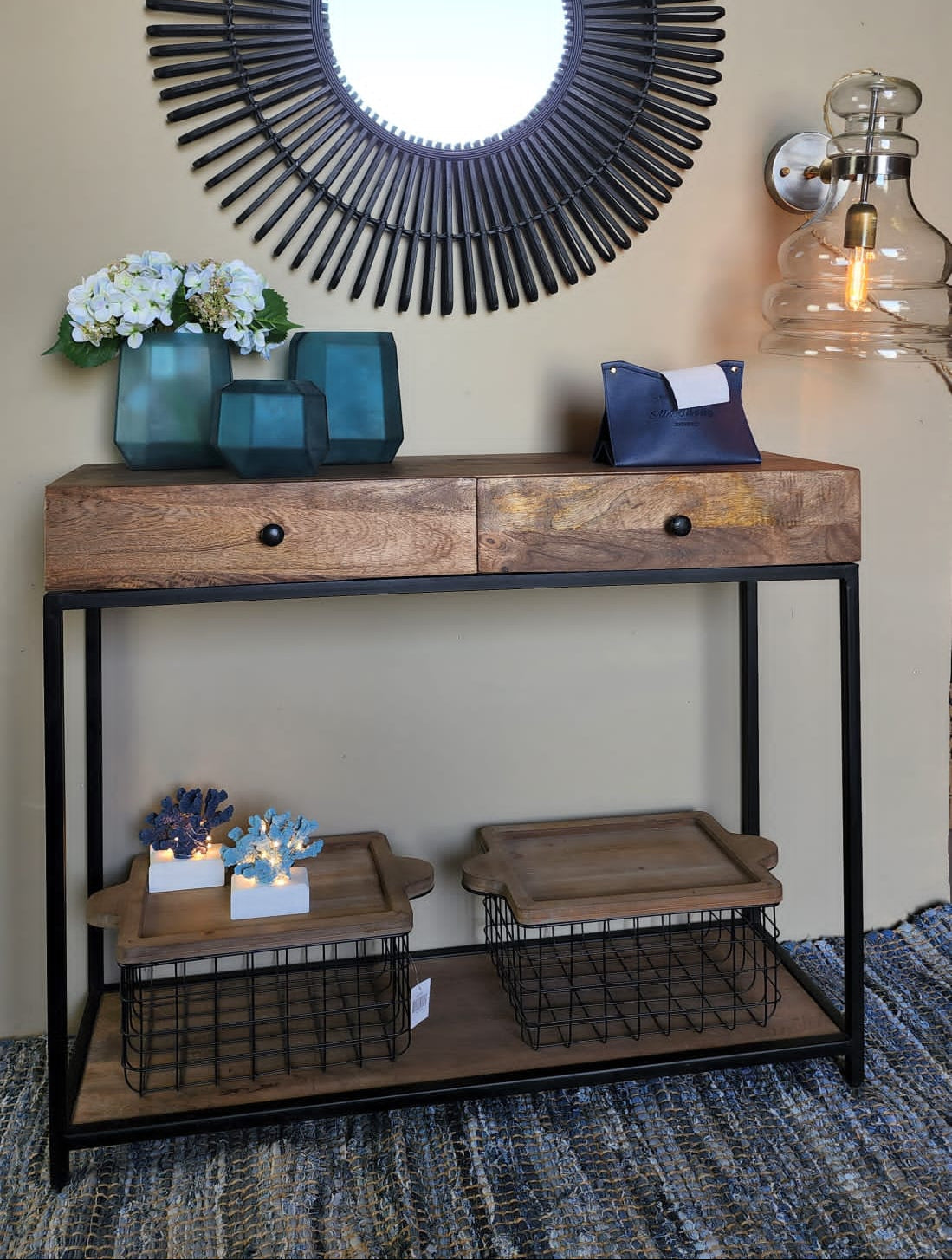 הקונסולה כוללת שתי מגירות אחסון לנוחות יומיומית, ומשטח תחתון פתוח המתאים לאחסון נעליים, סלסלות או פריטי נוי. הבחירה בעץ בגימור טבעי מדגישה טקסטורה עשירה וחמימה, בעוד שלדת המתכת מעניקה מראה קליל, יציב ועל-זמני.