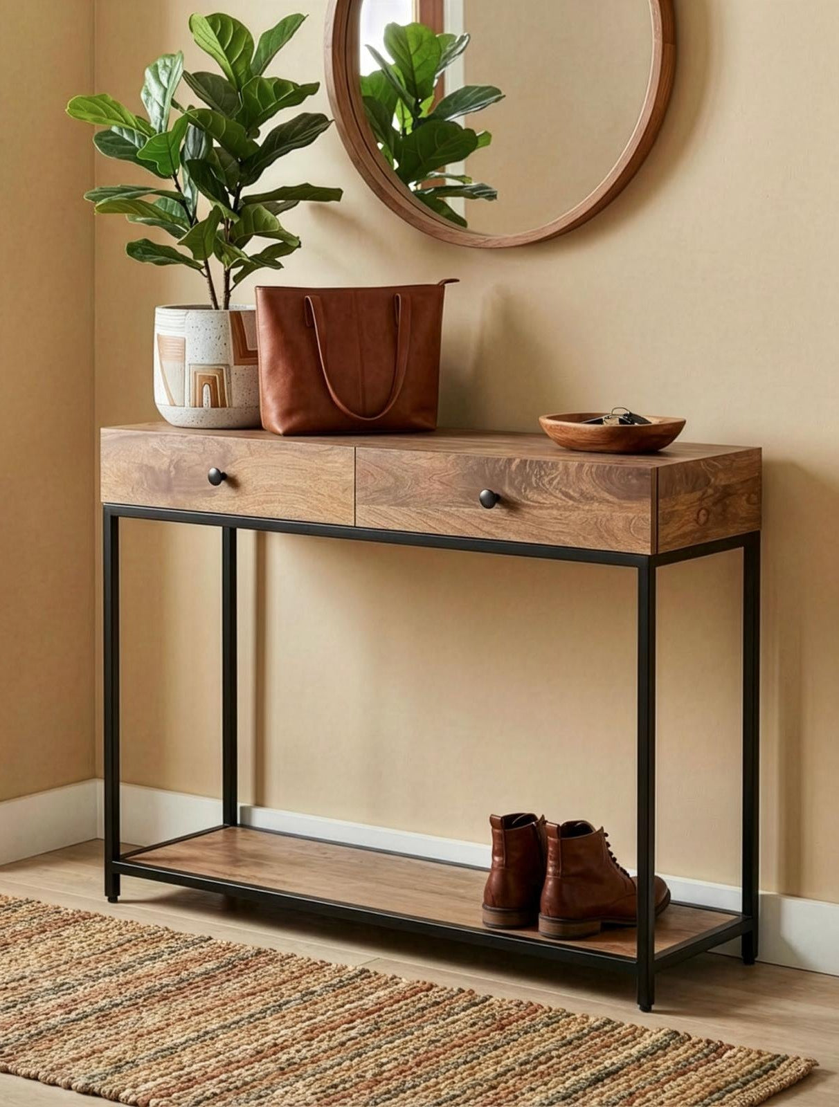 הקונסולה מתאימה במיוחד למי שמחפש קונסולה מעוצבת, קונסולה מעץ עם מתכת, או פתרון אלגנטי לכניסה לבית שמשלב עיצוב ופרקטיקה.