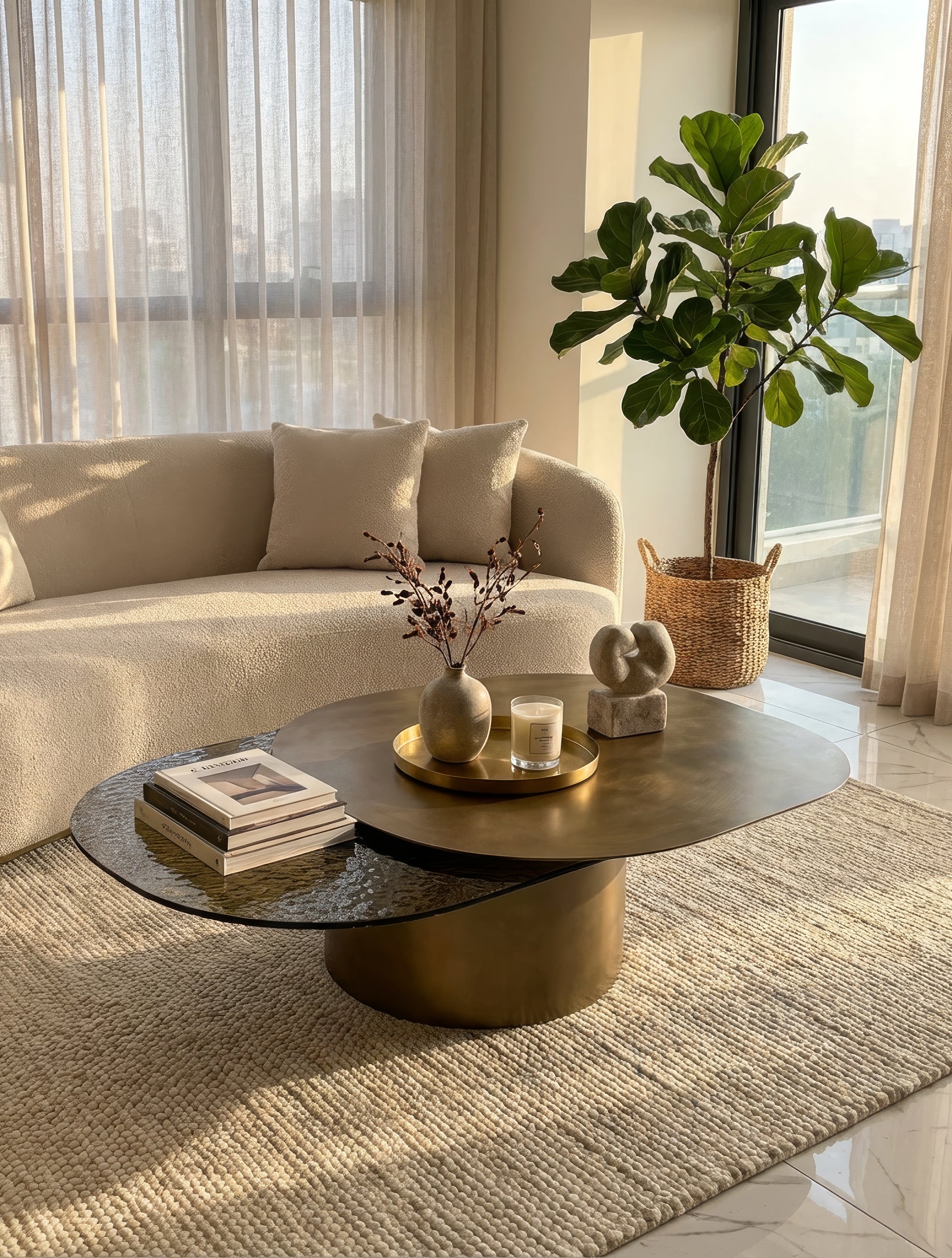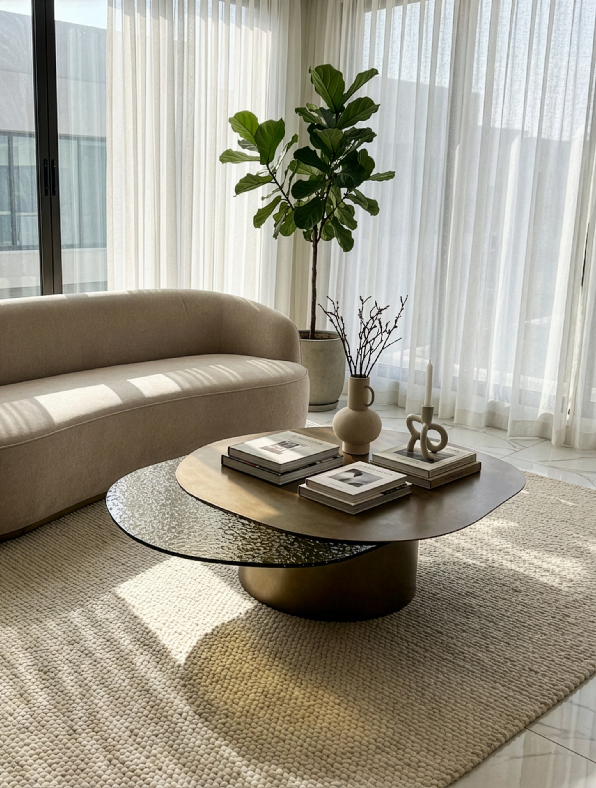 העיצוב המעוגל וההרמוני יוצר תחושת זרימה טבעית בחלל, בעוד השילוב בין זכוכית ומתכת מעניק לשולחן מראה קליל אך מרשים. זהו שולחן קפה לסלון שמצליח להיות גם פריט פונקציונלי לאירוח וגם מוקד עיצובי שמעשיר את החלל.