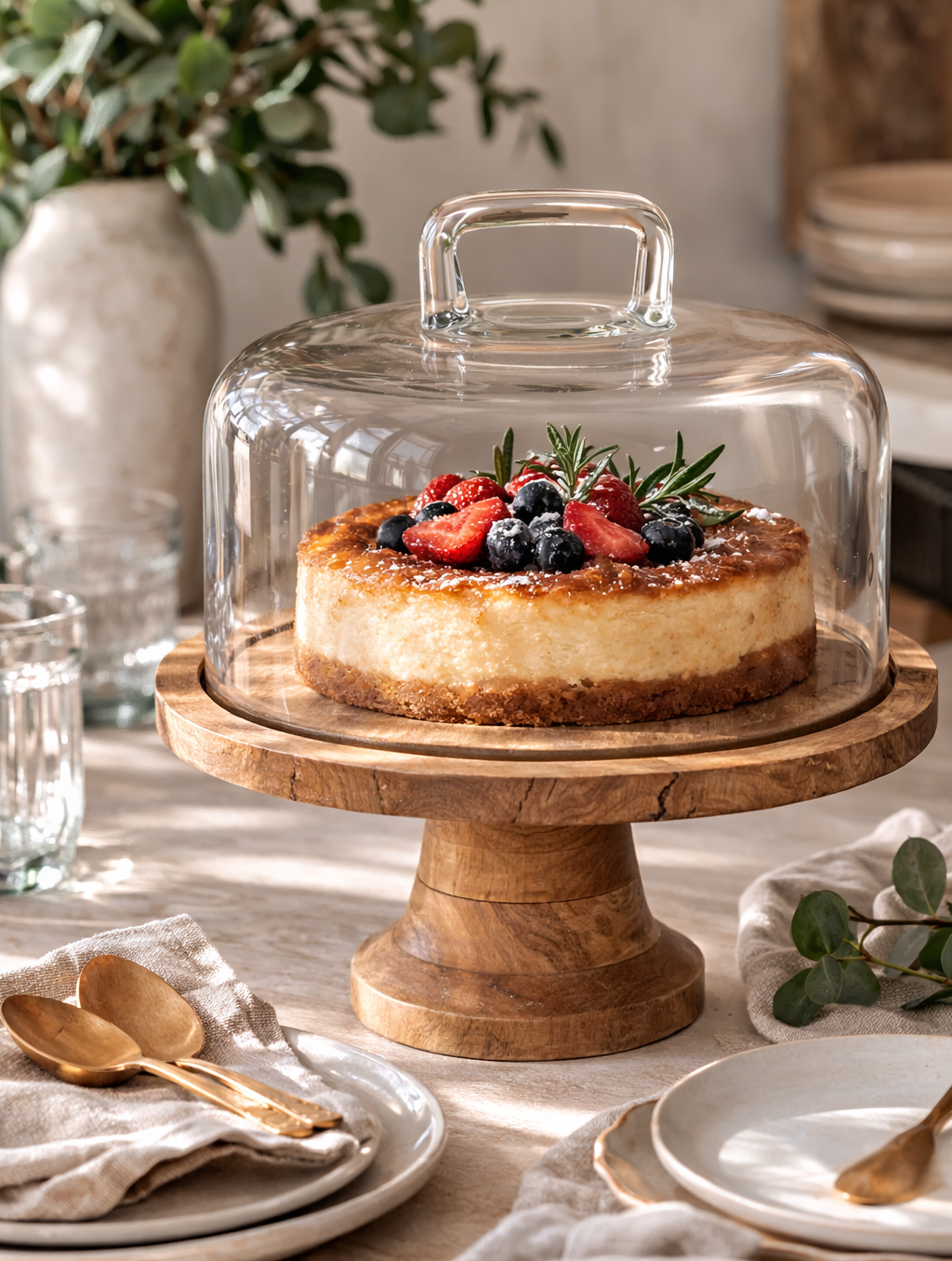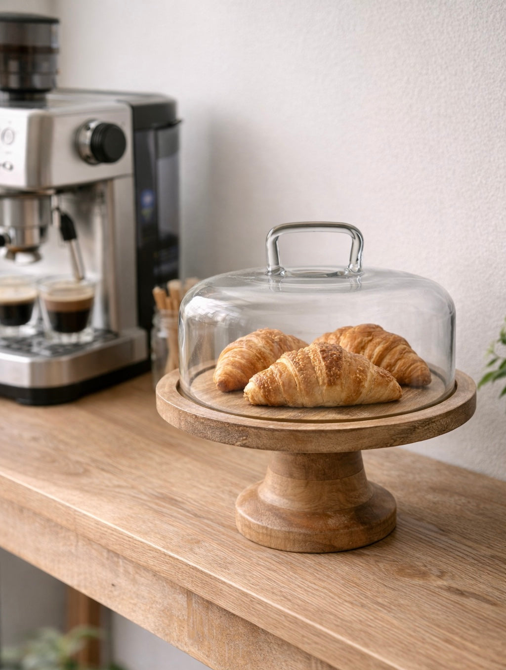 העיצוב הגבוה מעניק לעוגות ולקינוחים נוכחות מרכזית על השולחן, בעוד שכיפת הזכוכית שומרת על טריות ומאפשרת להציג את המאפים בצורה אסתטית ומזמינה. שילוב החומרים הטבעי יוצר פריט שמרגיש גם חמים וגם יוקרתי - מושלם למי שמחפש כלי הגשה מעוצבים לאירוח לצד פריטי דקורציה לבית שמשתלבים בהרמוניה עם המטבח והסלון.