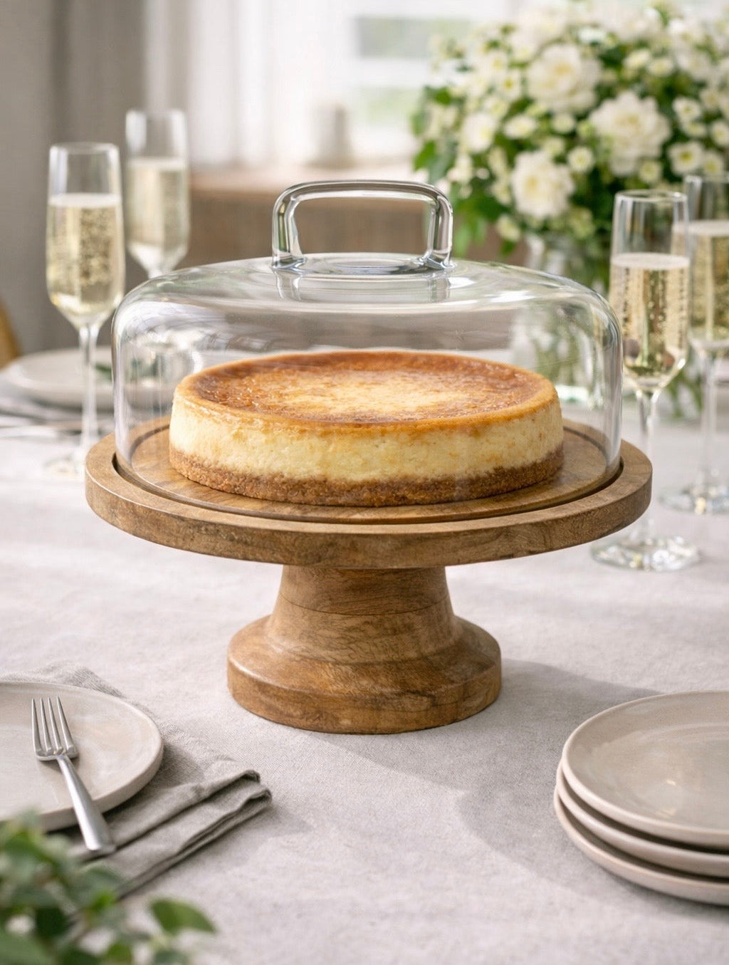 מעמד העוגה הזה משלב בין בסיס עץ טבעי מלא לבין פעמון זכוכית שקופה, ויוצר כלי הגשה יוקרתי שמדגיש כל עוגה, מאפה או גבינה בצורה אלגנטית ומרשימה.
