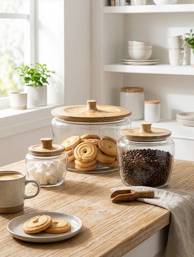 הזכוכית השקופה מאפשרת לראות בקלות את התכולה, בעוד מכסי העץ הטבעי מוסיפים חמימות ותחושת חומר טבעי שמתאימה למטבחים מודרניים, סקנדינביים וכפריים כאחד.
