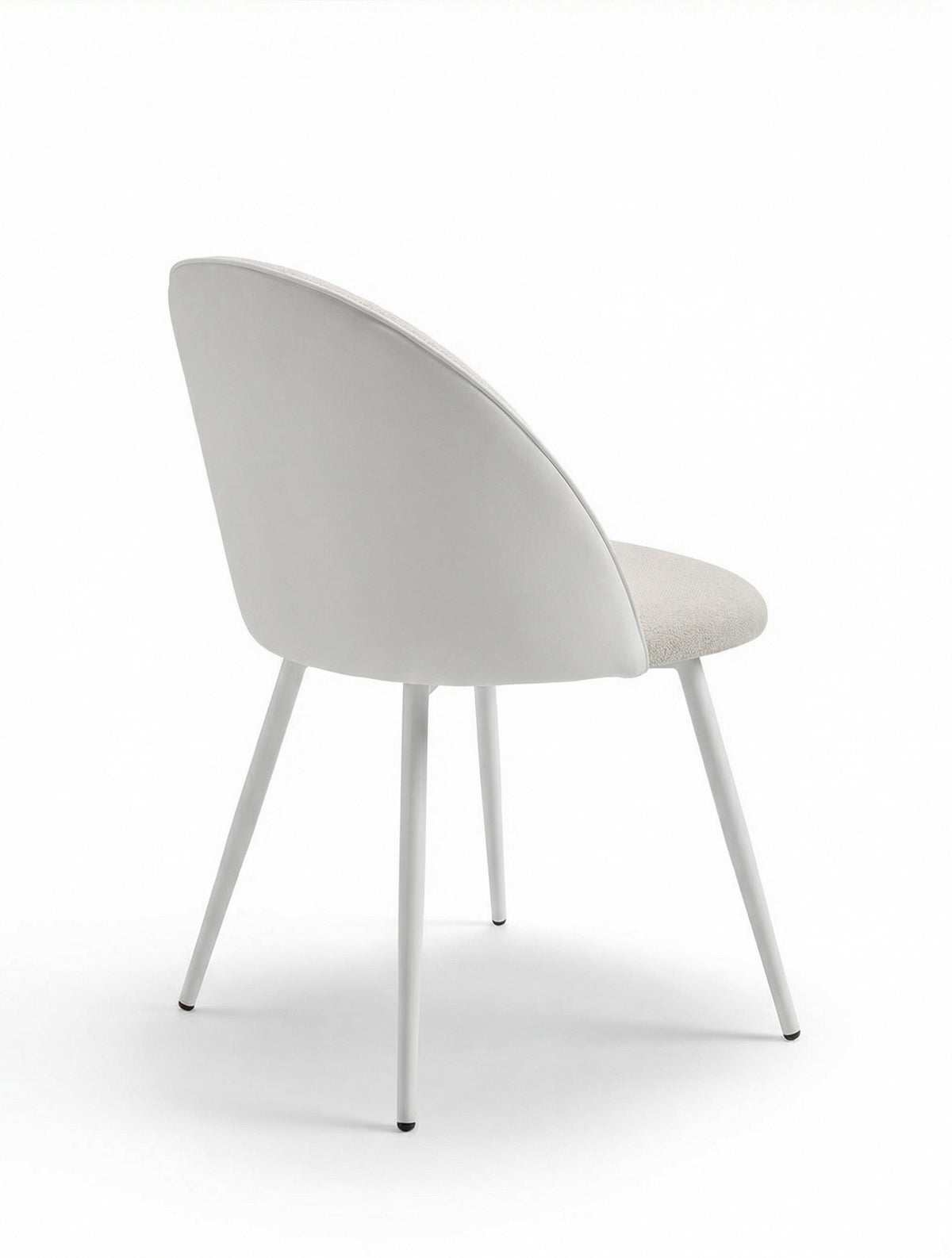 חומרים: ריפוד בד דמוי עור לבן לגב הכיסא, וריפוד בד ארוג בהיר בטקסטורה עדינה לחזית המושב + בסיס מתכת לבן