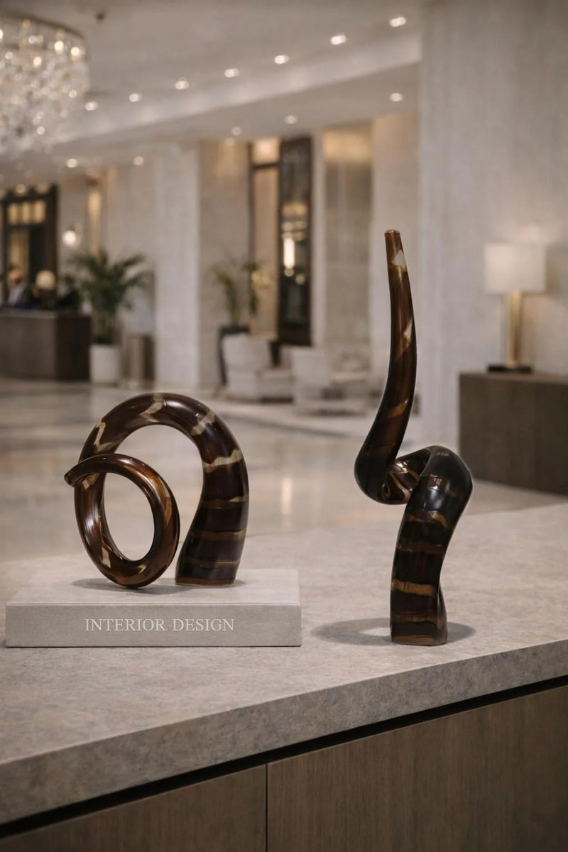 סט ייחודי של שני פסלי זכוכית בדוגמת קרניים בגוון חום-מוקה עם פסים עמוקים ותנועה פיסולית שמוסיפה דרמה אלגנטית לעיצוב. אלה פריטי נוי לבית שמייצרים מוקד עניין יוקרתי, ונראים מושלם כ־אקססוריז לבית על קונסולה, מזנון או שולחן כניסה.