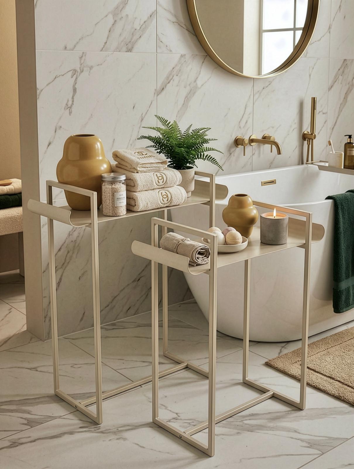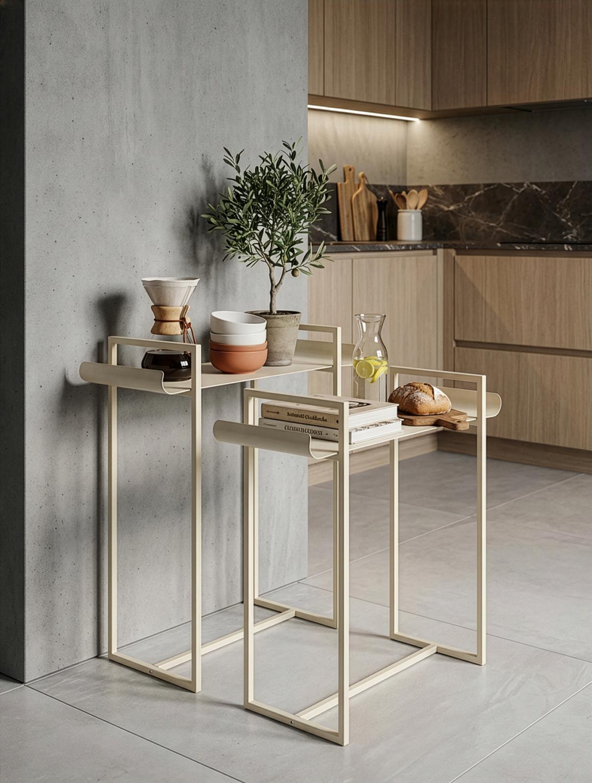 זוג מעמדי מתכת דקורטיביים בעיצוב מודרני נקי משלבים קווים מינימליסטיים עם מראה אלגנטי וקליל, ויוצרים פתרון מושלם להצגת פריטי נוי, צמחייה, כלי אירוח ואקססוריז לבית.