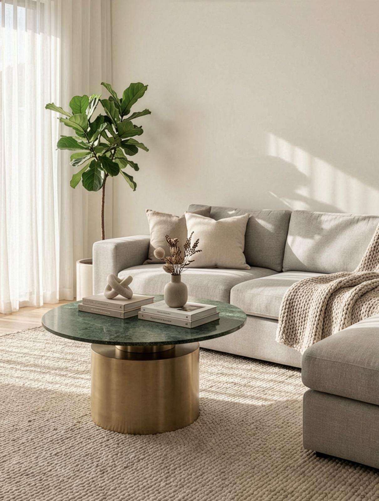 השולחן משתלב בצורה טבעית בסלון מודרני ומינימליסטי, ומשמש מוקד עיצובי מרכזי להצגת אקססוריז לבית, ספרי עיצוב ופריטי דקורציה.