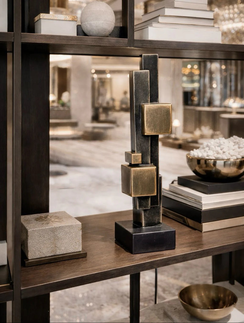 דקורציה מודרנית בגימור ברונזה מט עם קוביות זהב במראה מדוייק ויוקרתי, שמכניסה אופי ונוכחות נקייה לכל חלל. פריט של אקססוריז לבית שמוסיף עומק ואלגנטיות ל־דקורציה לבית ומשדרג מיד את עיצוב הבית בקו מינימליסטי.